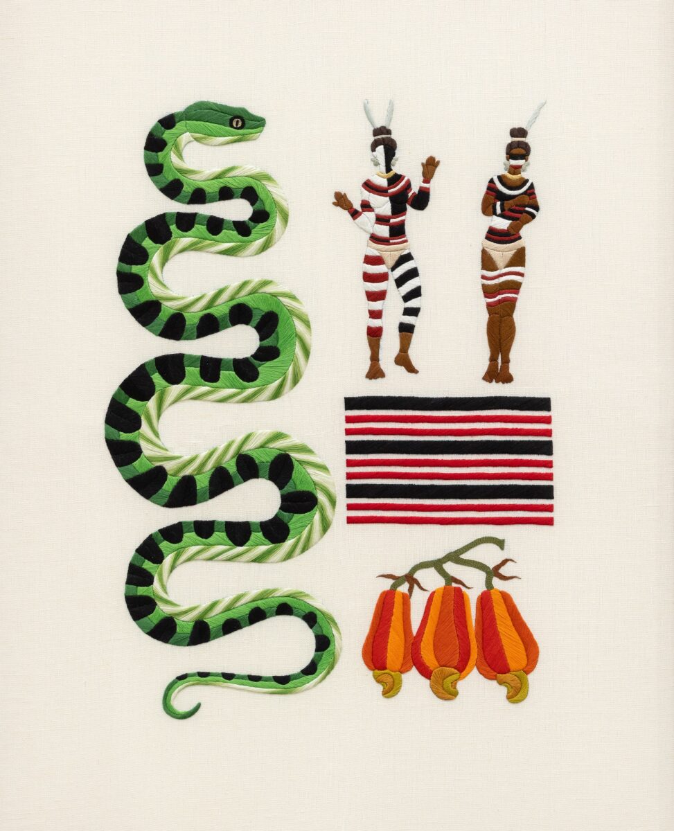 A técnica torna-se, assim, superfície de contenção sobre a qual emergem figuras indóceis, híbridas, encantadas e violentas. Suas imagens formam um arquivo de sonhos coloniais recompostos, como quem faz a arqueologia de um delírio.
