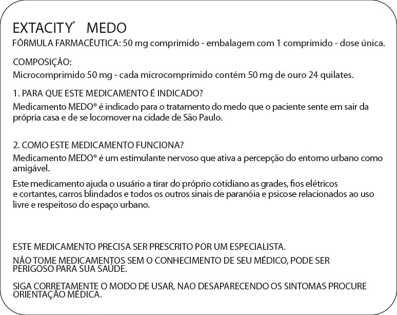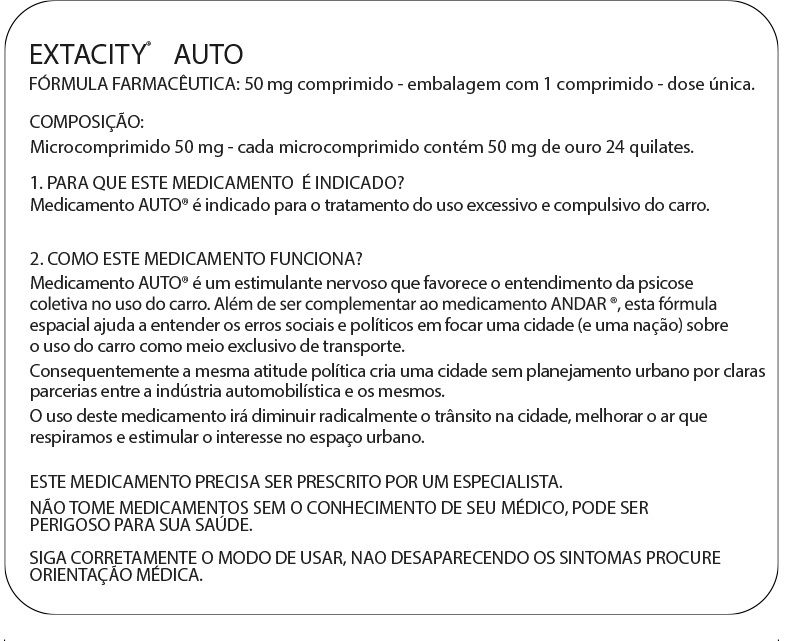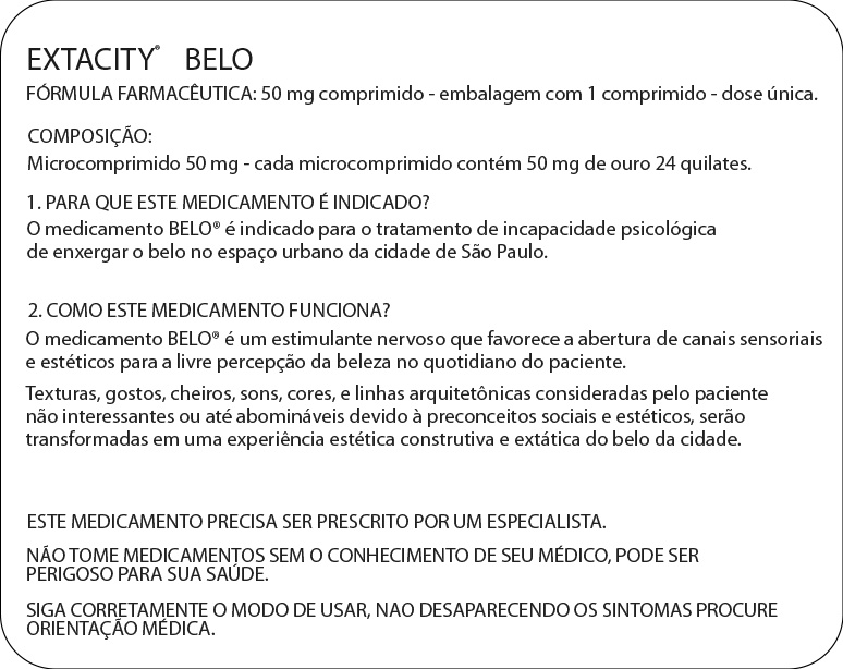 As pílulas Extacity interiorizam as questões fundamentais da cidade de São Paulo: ter medo, a dificuldade de ver o belo no cotidiano urbano, o uso excessivo do carro, e não caminhar na mesma, como também não considerar a urgência fundamental de novos espaços públicos, revalorizar os rios e questionar umas arquiteturas de caráter duvidoso.