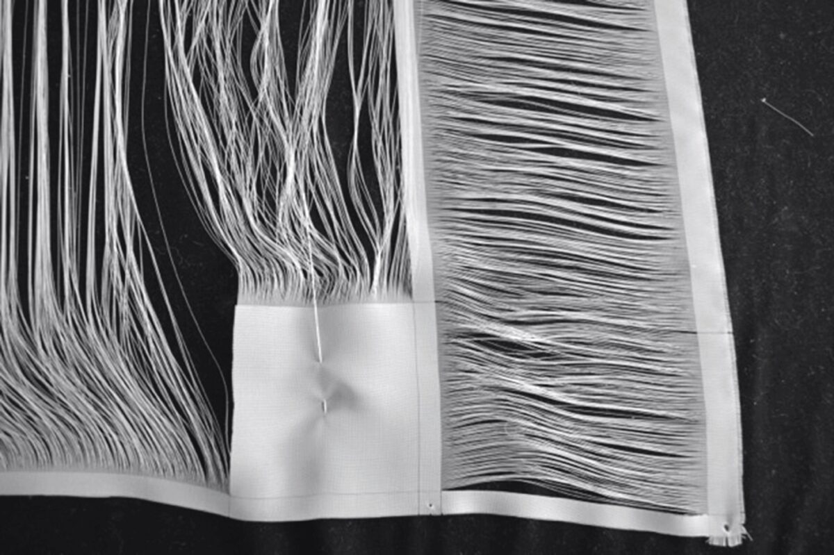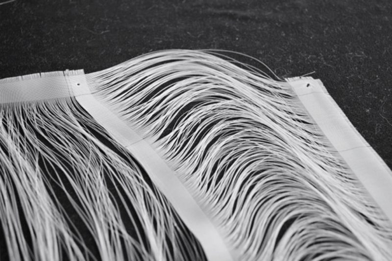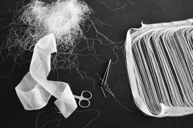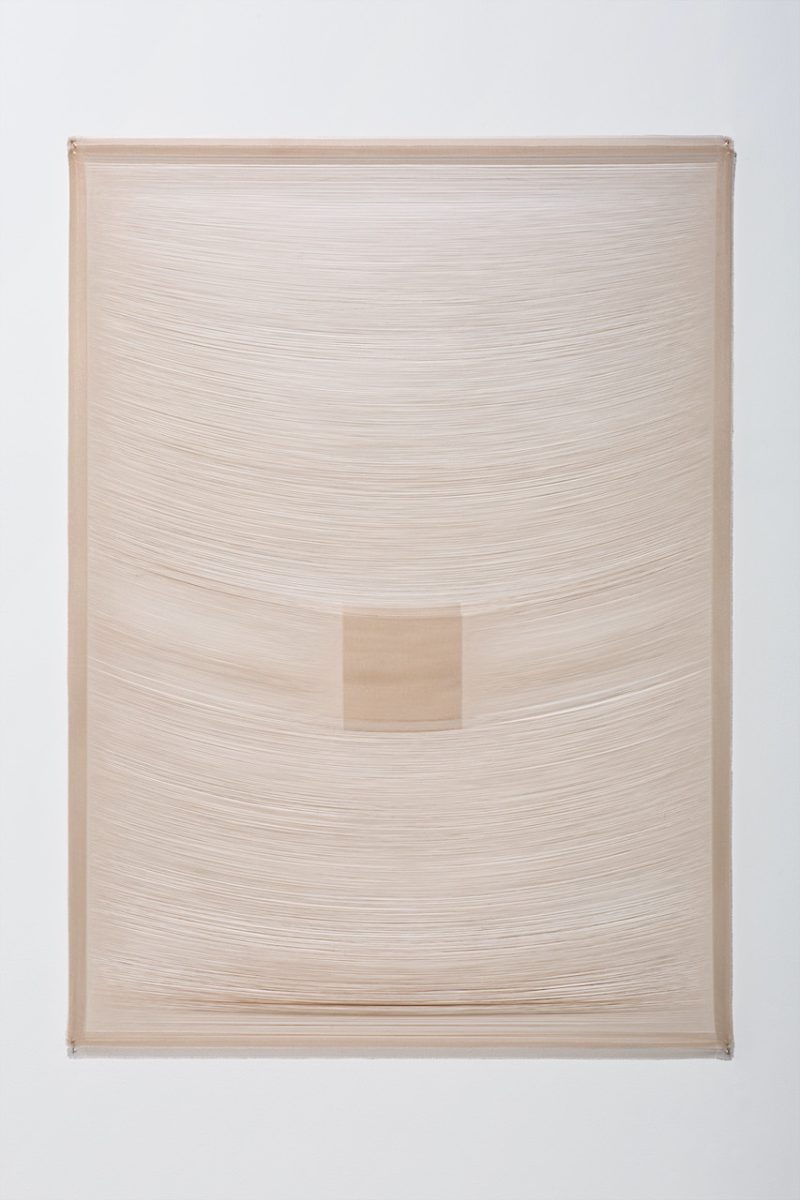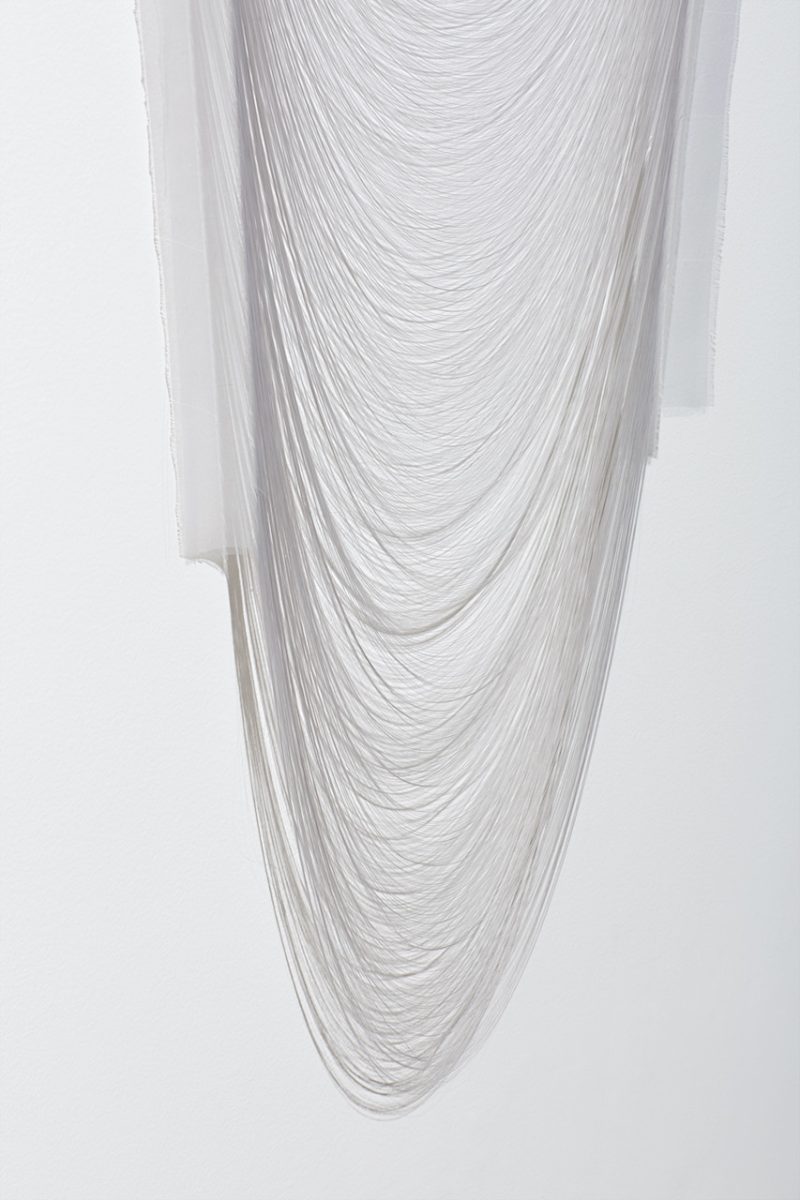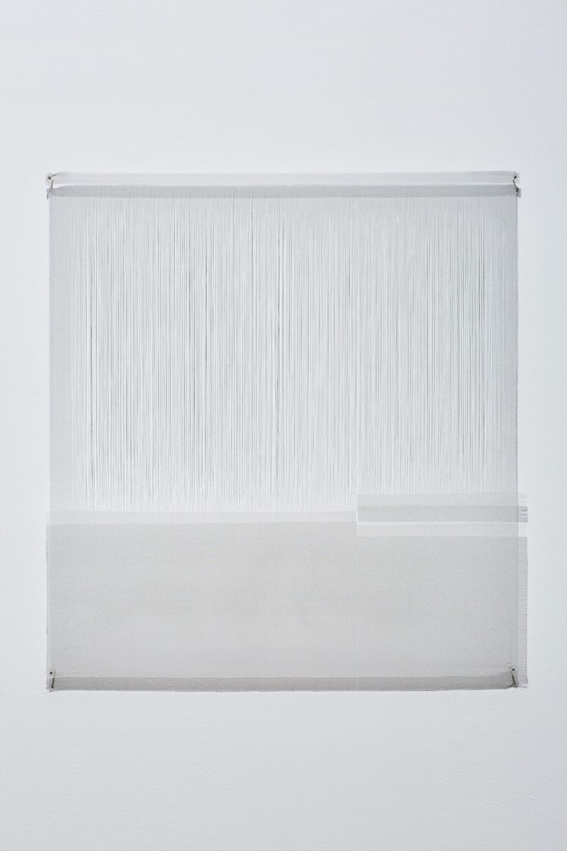 O tecido, material escolhido por mim para esta série, é constituído de uma estrutura de fios que se cruzam ordenadamente. As direções são sempre as do urdume, vertical, e da trama, horizontal. Essas linhas, perpendiculares entre si, criam minúsculos encontros, perfeitos e estáveis, que possibilitam ao todo a realização de uma superfície única, um plano outro, maleável e resiliente. Meus trabalhos com tecido se valem da lógica construtiva inerente ao próprio material para explorar questões como cheio e vazio, leve e pesado, tensão e distensão, superfície e profundidade, e a passagem do tempo. As ações de cortar e desfiar, pregar e esticar são os únicos elementos do jogo.