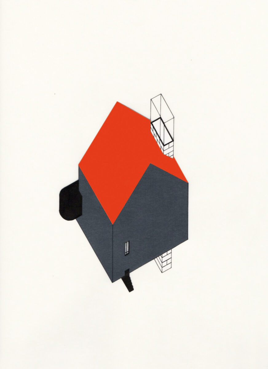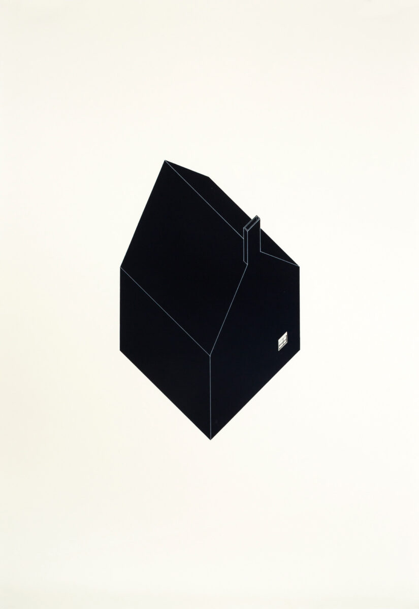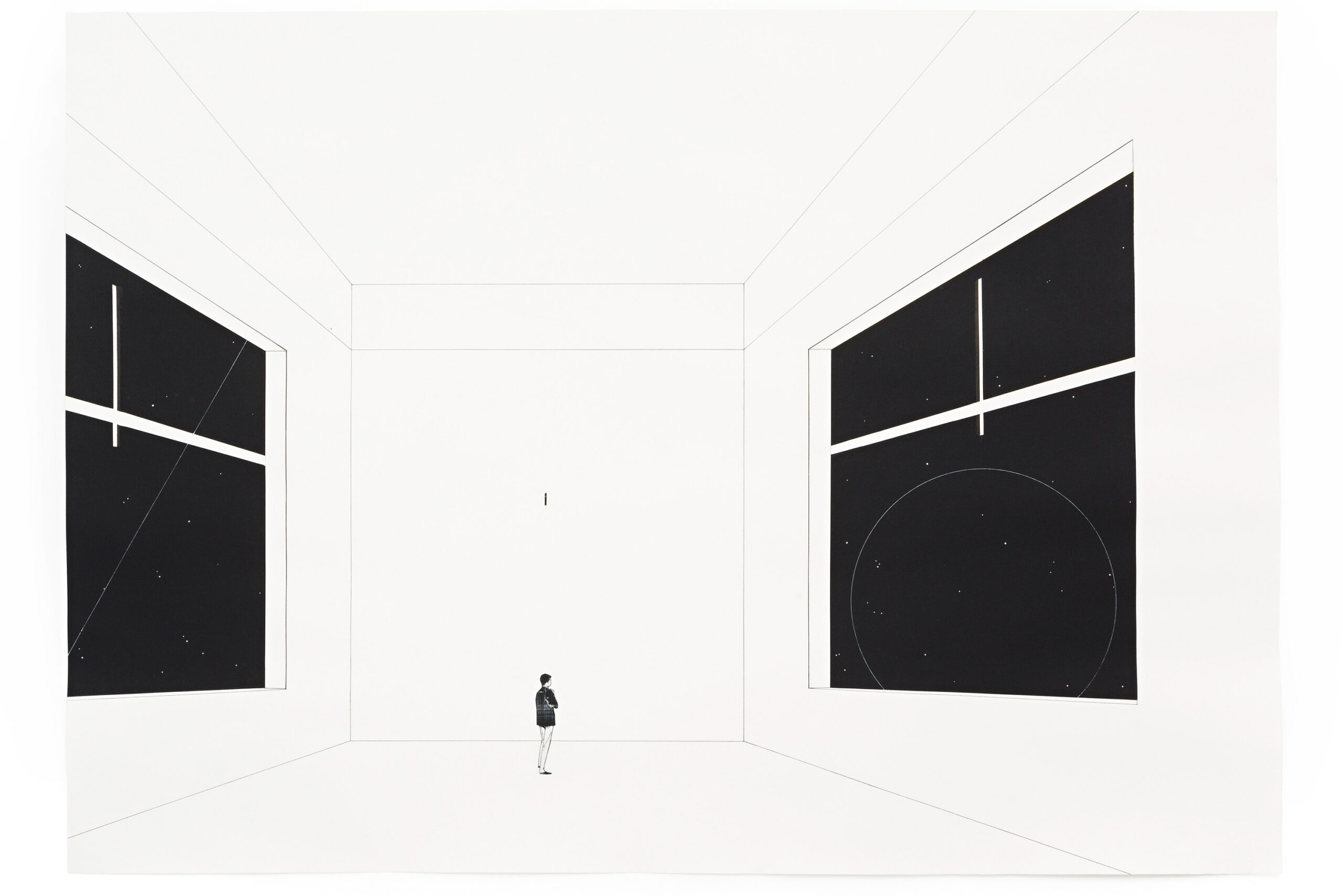 Uma obra das obras que não tem seu par tem duas imensas janelas. É a única ilustração de um ambiente interno. A altura do cômodo e as dimensões das aberturas são agigantadas. O sujeito ali olha através da janela, cujo peitoril está à altura dos seus olhos, e, portanto, seu ângulo de visão só abrange o quadrante superior. Ele olha um céu noturno salpicado de pontos brancos, como estrelas, e dois círculos, como duas órbitas concêntricas nitidamente desenhadas. A imagem tão sintética nos instiga de alguns modos: [1] as órbitas fazem ver que ali o céu é plano e está em movimento [2] enquanto a sala, representada em perspectiva, tem as duas paredes laterais escapando para mais de um ponto de fuga, todos verticalmente alinhados no segmento definido entre a cabeça do sujeito e a abertura mínima, como uma inesperada seteira, na parede do fundo acima dele. O piso e o teto não seriam planos paralelos, e as grandes janelas, de fato, não seriam retângulos. Perspectiva fingida ou, de novo, o trompe-l’oeil. Outra vez o contraste, ou a mediação, entre o que é verdadeiro e o que é simulado. Justamente o alinhamento vertical dos pontos de fuga coloca em destaque uma abertura ínfima e fora do domínio visual daquele sujeito; a seteira quase perdida na parede que é coplanar ao céu poderia eventualmente enquadrar um foguete. Seria uma casa ou uma espaçonave?