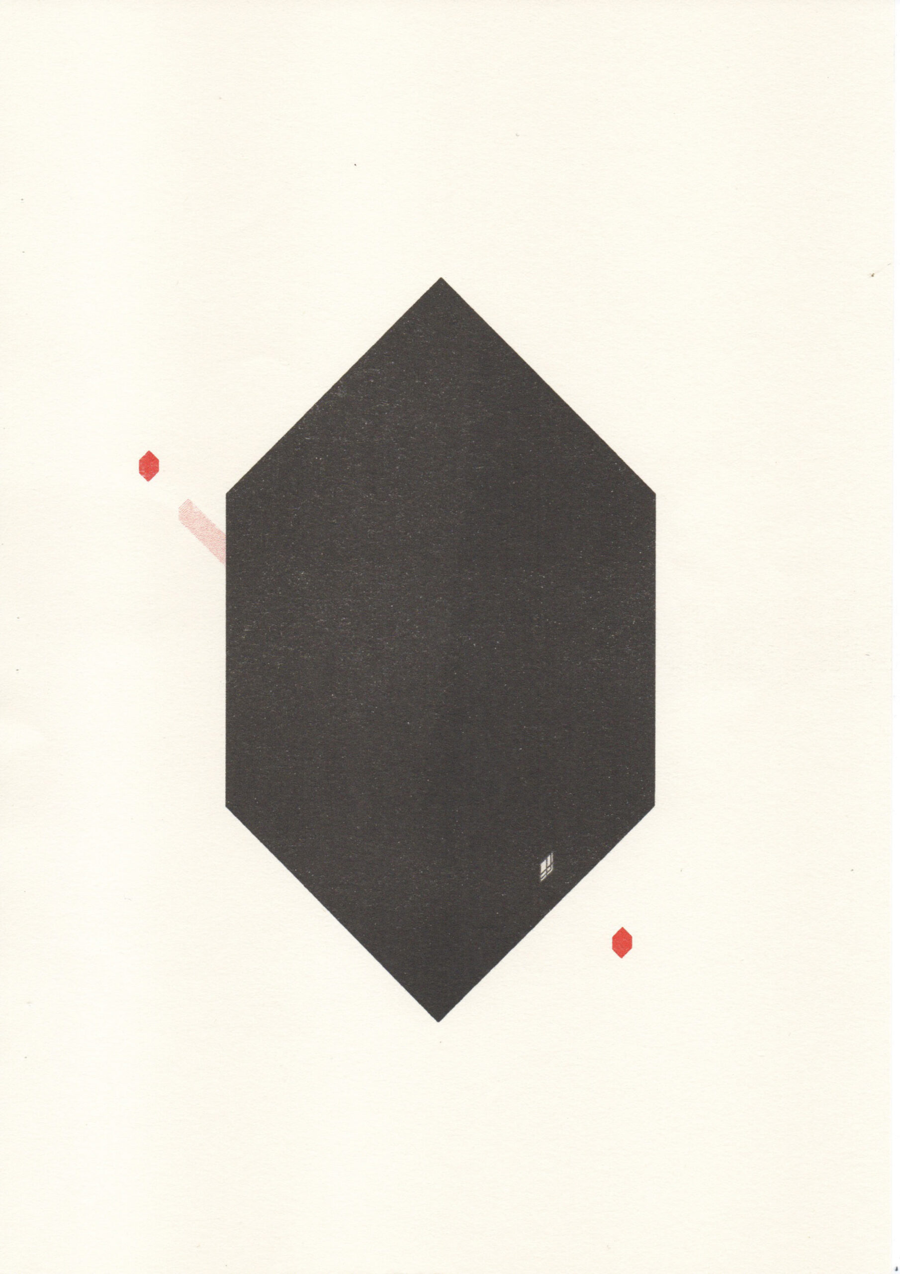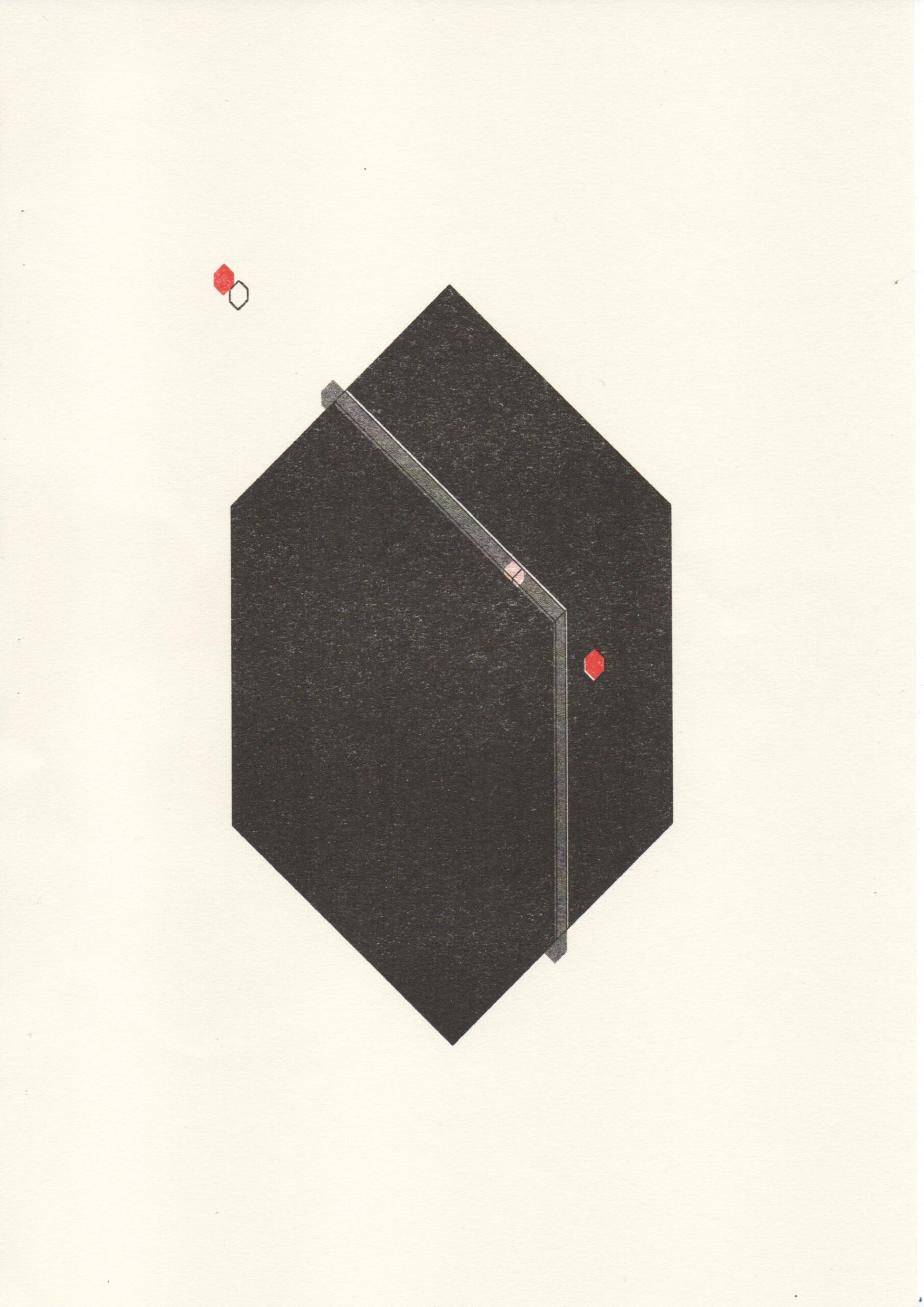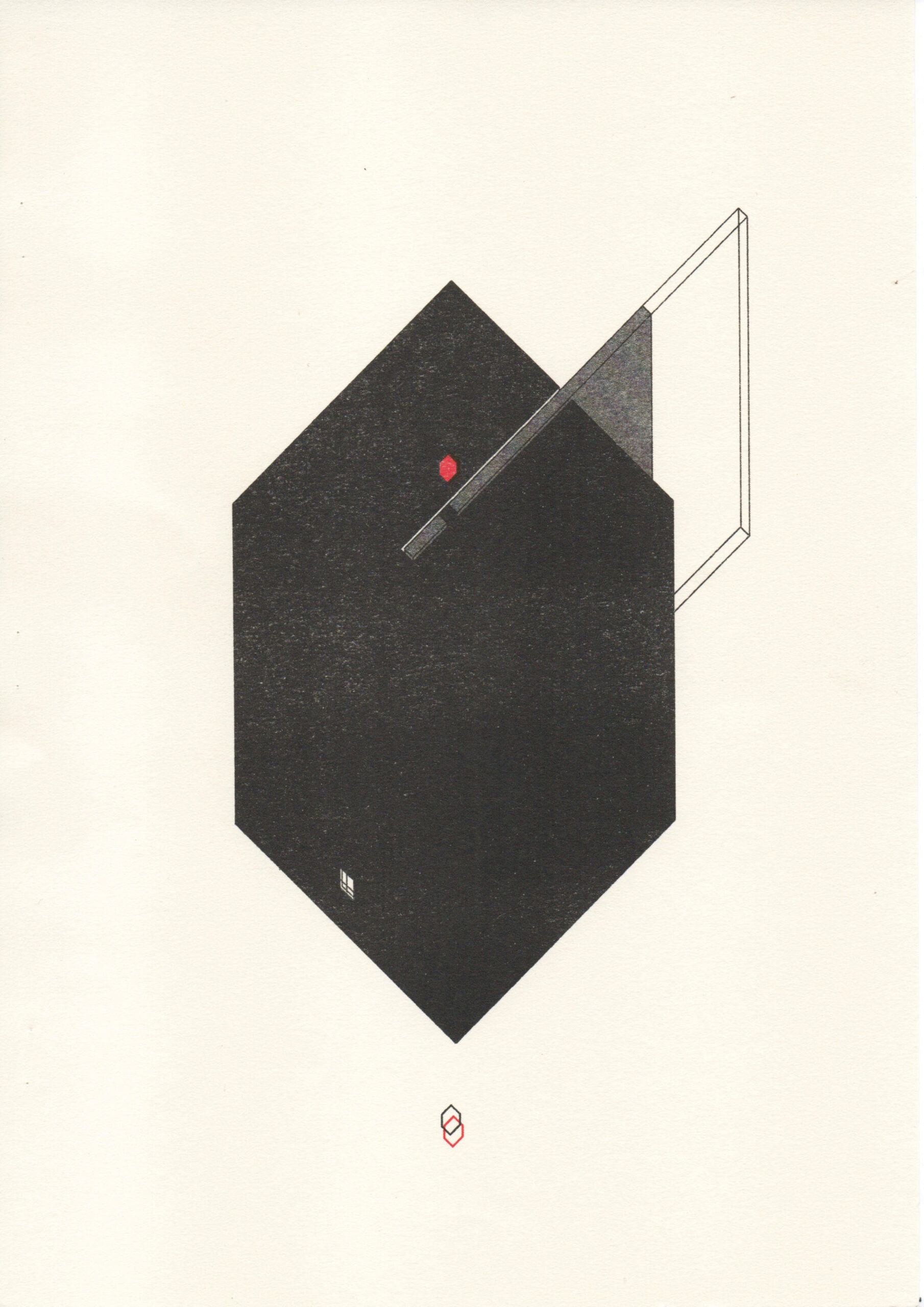 Uma obra das obras que não tem seu par tem duas imensas janelas. É a única ilustração de um ambiente interno. A altura do cômodo e as dimensões das aberturas são agigantadas. O sujeito ali olha através da janela, cujo peitoril está à altura dos seus olhos, e, portanto, seu ângulo de visão só abrange o quadrante superior. Ele olha um céu noturno salpicado de pontos brancos, como estrelas, e dois círculos, como duas órbitas concêntricas nitidamente desenhadas. A imagem tão sintética nos instiga de alguns modos: [1] as órbitas fazem ver que ali o céu é plano e está em movimento [2] enquanto a sala, representada em perspectiva, tem as duas paredes laterais escapando para mais de um ponto de fuga, todos verticalmente alinhados no segmento definido entre a cabeça do sujeito e a abertura mínima, como uma inesperada seteira, na parede do fundo acima dele. O piso e o teto não seriam planos paralelos, e as grandes janelas, de fato, não seriam retângulos. Perspectiva fingida ou, de novo, o trompe-l’oeil. Outra vez o contraste, ou a mediação, entre o que é verdadeiro e o que é simulado. Justamente o alinhamento vertical dos pontos de fuga coloca em destaque uma abertura ínfima e fora do domínio visual daquele sujeito; a seteira quase perdida na parede que é coplanar ao céu poderia eventualmente enquadrar um foguete. Seria uma casa ou uma espaçonave?