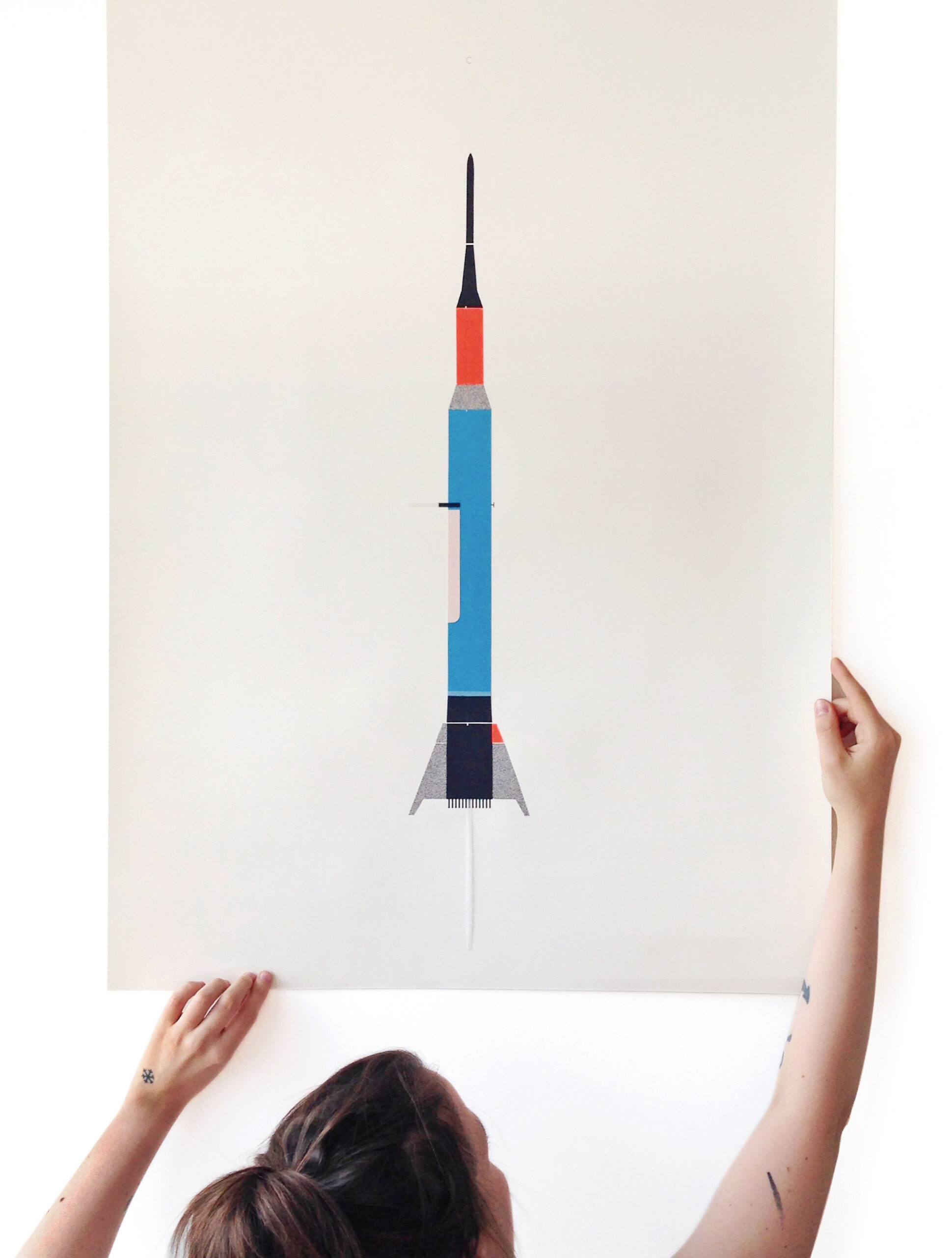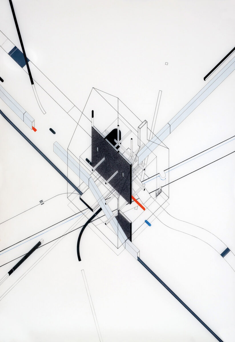 É sobre a beleza dessas obras, extraídas da experiência de cidades a partir de uma sensibilidade notável e uma racionalidade e realizadas com extremo apuro técnico em desenhos rigorosamente executados que Bruna Canepa funda sua plataforma artística. Então, sobre a plataforma, o foguete. Aquelas mesmas duas cores, azul e vermelho, usadas sempre com tanta parcimônia sobre o branco do papel e o preto dos traços, aqui neste artefato elas parecem explodir. É um foguete de carga, que pode transportar a qualquer ponto do espaço toda riqueza cultural que constitui o acervo do nosso imaginário urbano.