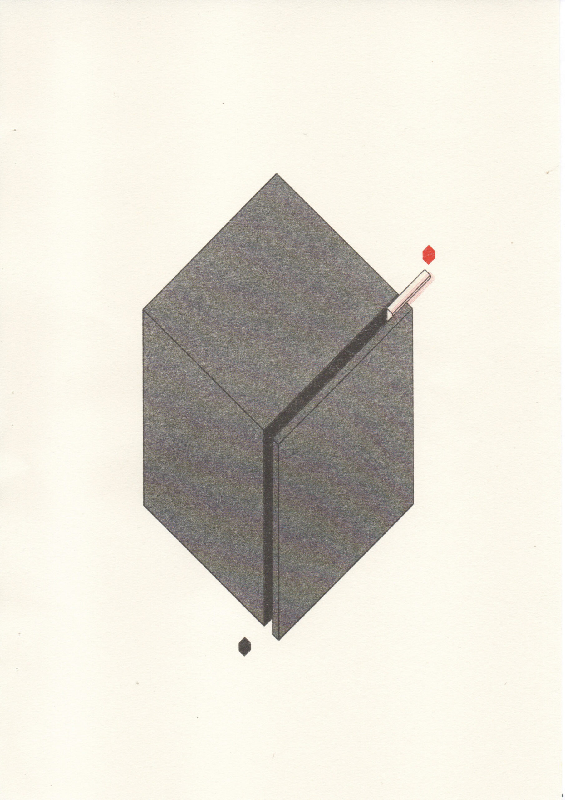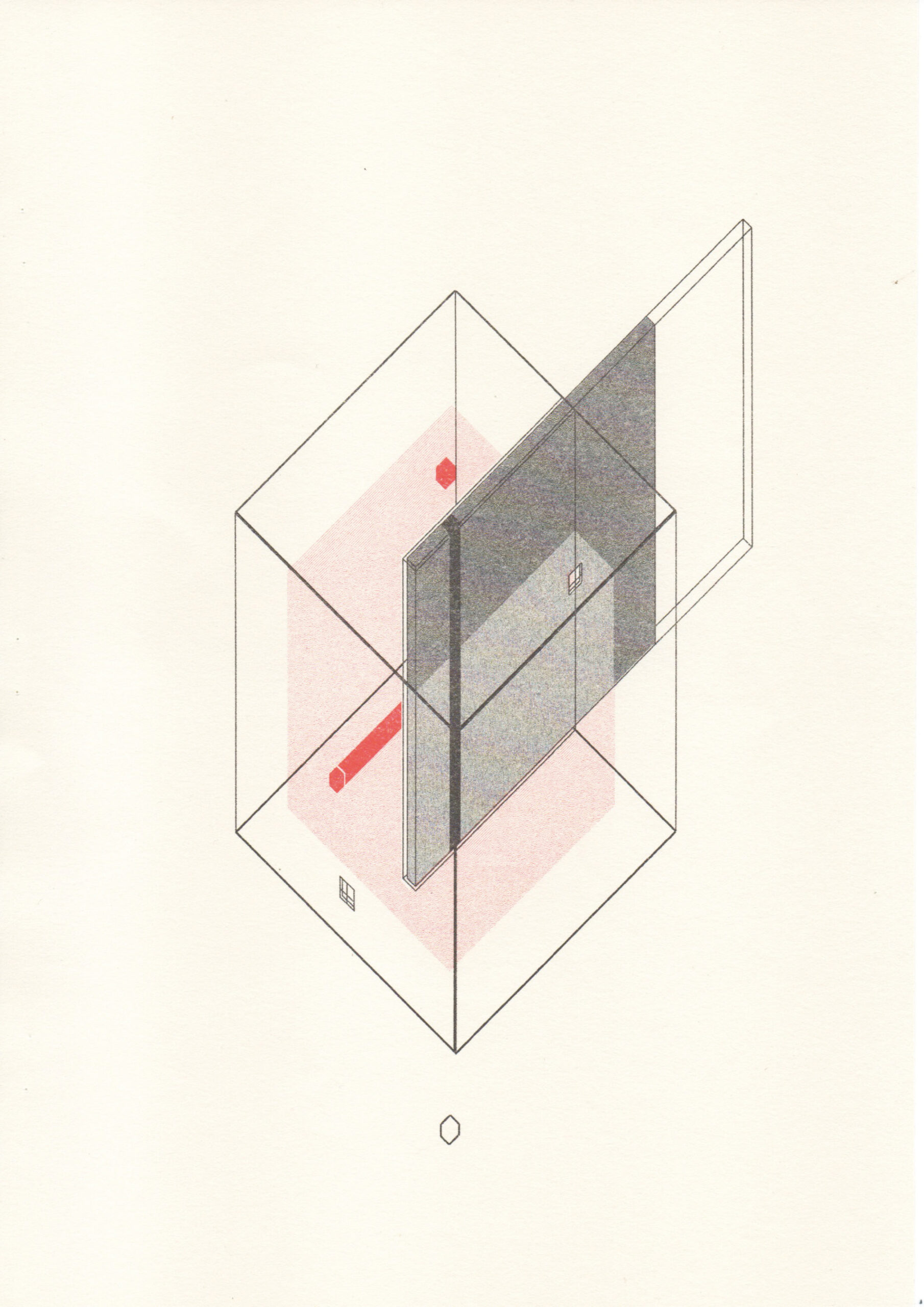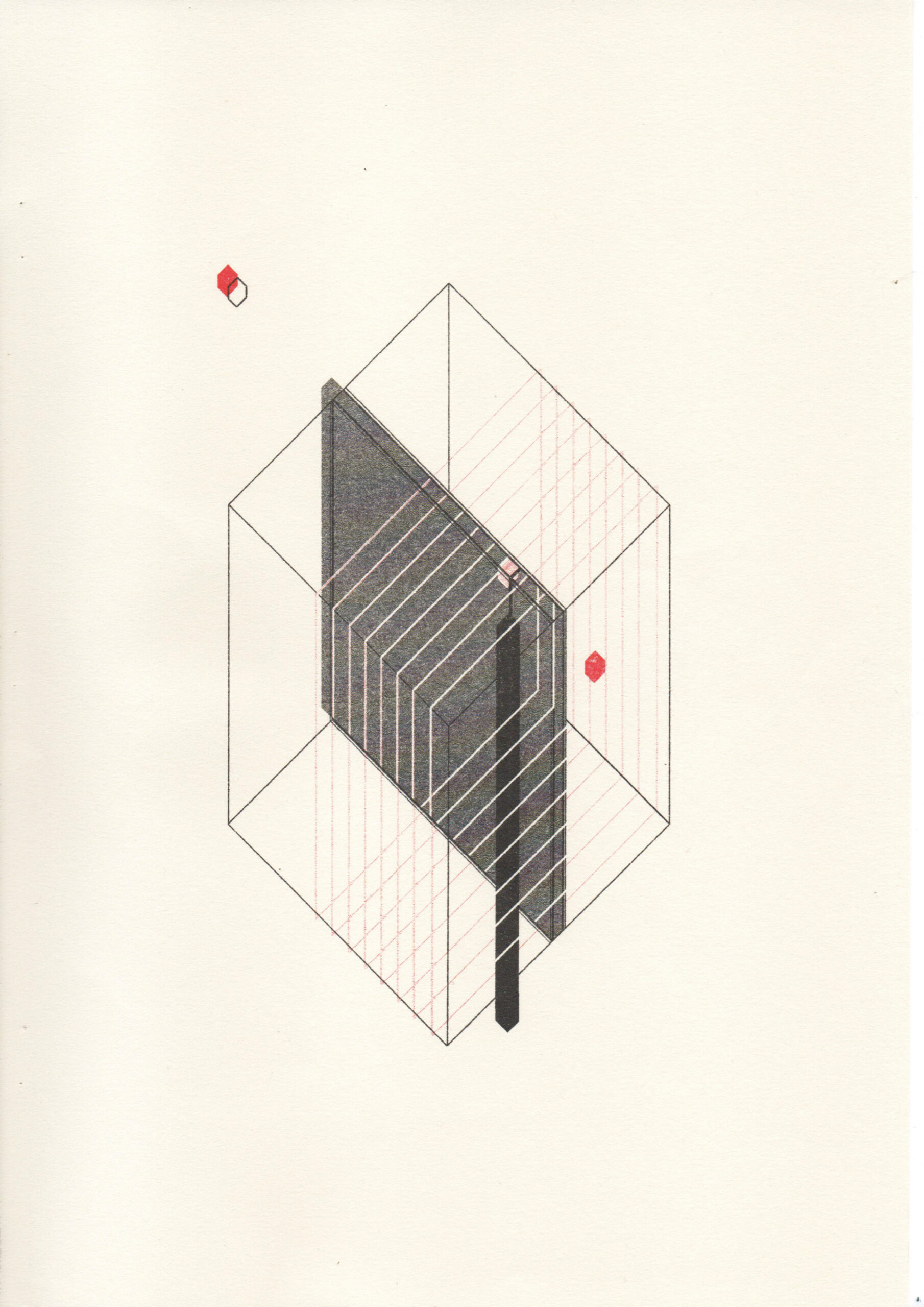 É porque está munida deste acervo, ou carga cultural, que Bruna propõe com clareza didática as quatro operações sobre um cubo [denominados platônico, à primeira vista, impossível e ideal]. Ainda aqui, quatro dípticos, como se [a] o primeiro descrevesse o propósito e [b] o segundo desvendasse a estratégia. Em platônico, [a] ligar um ponto na base de uma face ao topo da face oposta; [b] uma fresta e uma escada. Em à primeira vista, [a] ligar um lado ao lado oposto em mesmo nível, próximo à base; [b] atravessar por um túnel plano. Em impossível, [a] ligar dois pontos altos em faces opostas; [b] uma combinação dos dois primeiros, mas em vez de escada, um fosso vertical, elevador, e o plano vertical subtraído para a conexão horizontal entre os dois. O ideal lança mão dos mesmos elementos, que são a escada e o fosso, a fresta e o túnel, como estratégias de conectar como um caminho a percorrer ou apenas visualmente. Mais que a soma, aqui também se sugerem ocupações ou volumes cavados dentro dos volumes. São operações arquitetônicas que evidenciam a proximidade da artista com esta abordagem.