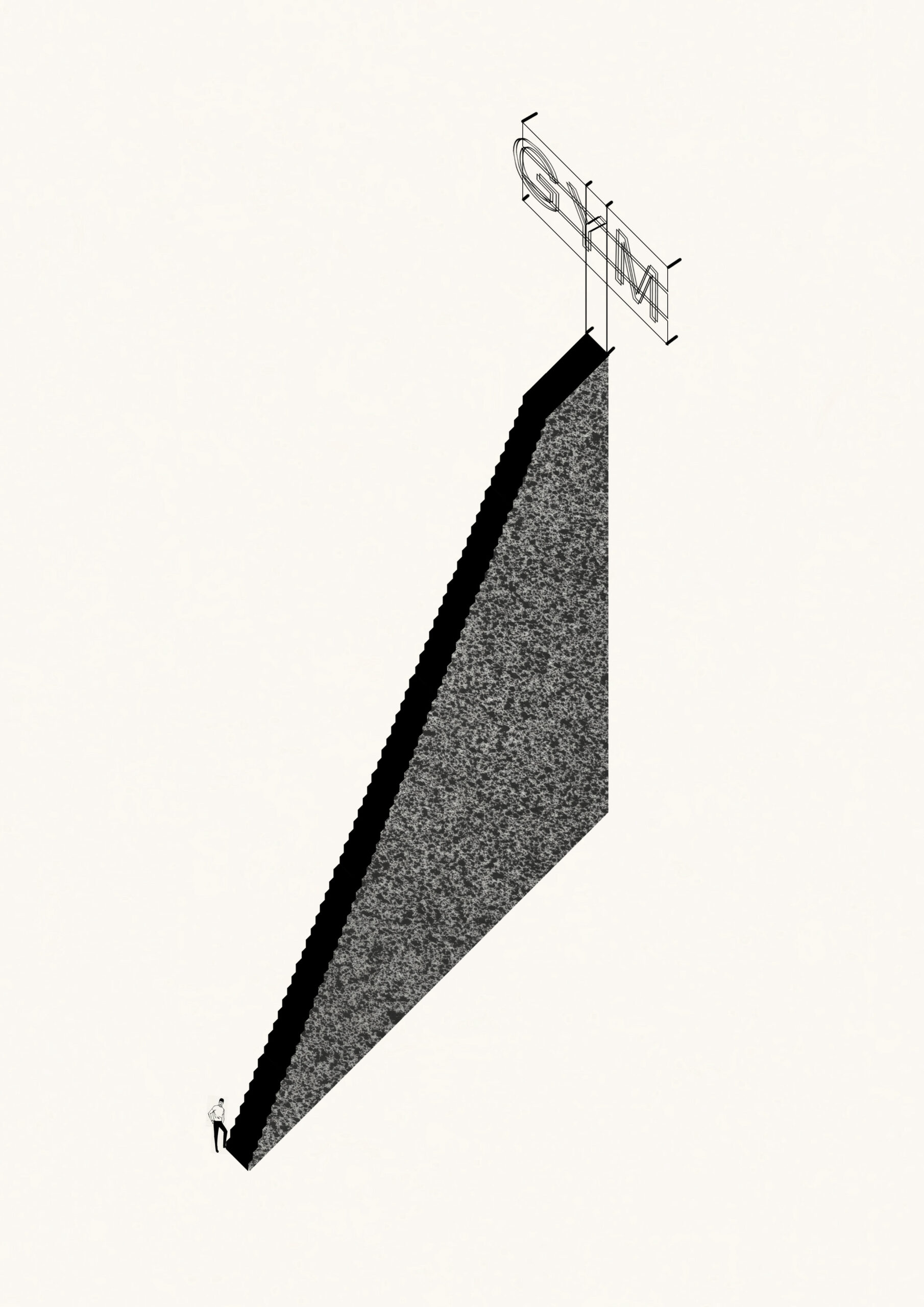 E, seguindo ainda por esse mesmo caminho, ela vai mais longe. Em proposal for a gym [trabalho colaborativo / Estúdio Miniatura], a sugestão de arquitetura é tão nítida que ganha inclusive programa. A gente imagina, de fato, aquela parede espessa como um edifício estreito para abrigar a atividade solitária em que o sujeito, preso ao próprio corpo, esgota-se ativamente na mais extrema solidão.