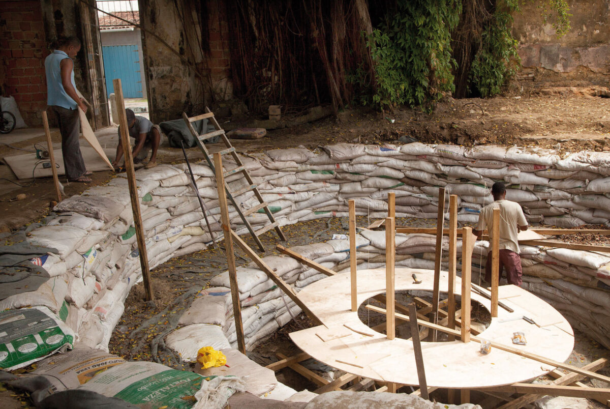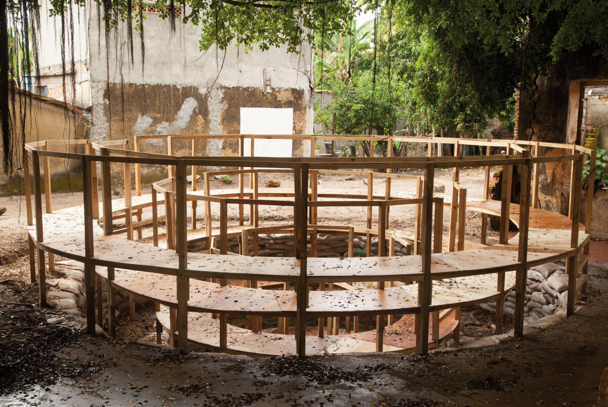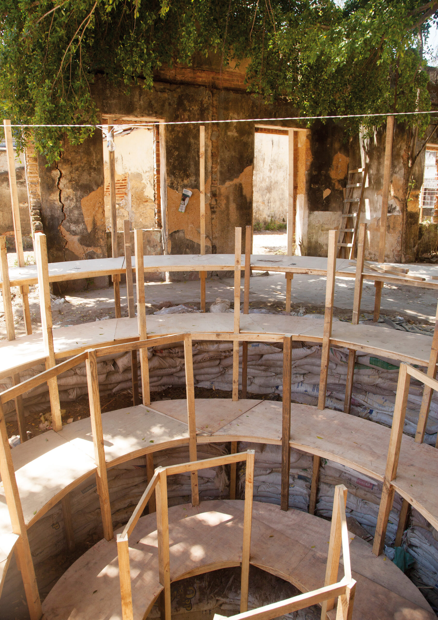 A arquitetura do teatro se caracteriza por ser aberta e pela ausência de fronteiras entre palco e bastidor. Não há pano de fundo, e a plateia se reúne em volta de um ponto central. Essa circularidade permite que todos possam se ver. A construção de madeira ao ar livre estende essa não hierarquia horizontal para fora: de todos os ângulos, o entorno se mostra como parte integrante do teatro.