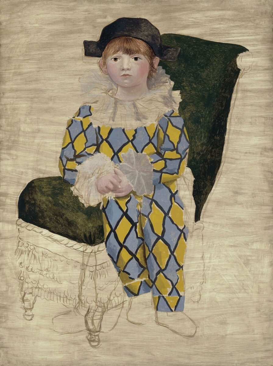 É como uma aula de pintura e desenho, com diversos tratamentos que se justapõem em harmonia e serenidade. O menino está acomodado entre duas manchas pretas, que representam a cadeira, e tem o rosto representado com traços simples e manchas que indicam o volume das faces. Sua roupa está estilizada em losangos amarelos e azuis e tornam seu corpo quase planificado. Se deduz que as manchas acinzentadas são os babados do figurino que emolduram o decote e os punhos. Os pés da cadeira estão simplesmente indicados por traços espontaneamente inacabados. O artista vanguardista não se preocupa em disfarçar a hesitação com a transparência da cena, porque deixou o sinal de um terceiro pé desenhado embaixo da cadeira. Aqui, Picasso explicita toda a liberdade lúdica da infância, afirmando-a com respeito e seriedade (e aqui penso estar evidente a influência de Velázquez na obra de Picasso). O menino está com uma roupa divertida sentado em um “trono”, e não uma cadeira qualquer. O artista enobrece a infância.