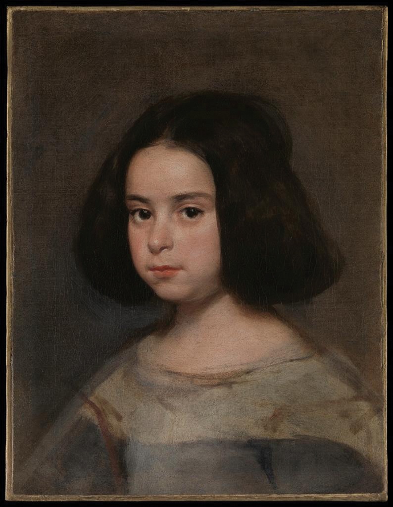“Retrato de menina” (1640), de Velázquez, é um exemplo da naturalidade que o artista captava de seus retratados. Embora a tela esteja inacabada, a face está pintada com terna dedicação e realismo. Não há informação de quem seja a modelo, e não é necessário saber. O pintor foi um dos expoentes do barroco e renomado artista da corte de Felipe IV de Espanha. Ele não registrou somente a nobreza, como também as figuras menosprezadas pela elite, sendo a série dos bobos da corte e da criadagem os melhores exemplos, resgatando a dignidade desses personagens. Sua pintura não apenas trouxe frescor ao barroco espanhol, mas também serviu de modelo aos pintores vanguardistas, como os impressionistas e o próprio Picasso. Velázquez soube tirar o máximo da representação em poucas pinceladas, como é possível ver nos cabelos brilhantes, nas pupilas negras e no acetinado da pele da menina. Poderia ser um retrato sério e pesado, mas o artista mostra leveza e, talvez, indagação. As feições da menina são ainda infantis, embora seu penteado já a introduza na moda do mundo adulto. Neste retrato aparentemente singelo, tem-se o nascimento de uma personalidade, o início de uma pessoa em formação retratada pelos olhos do artista.