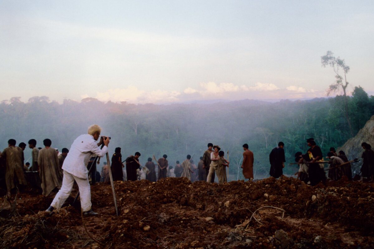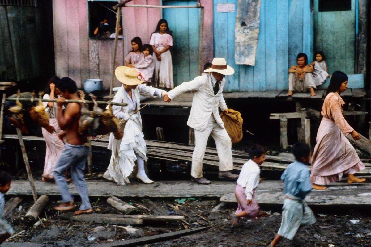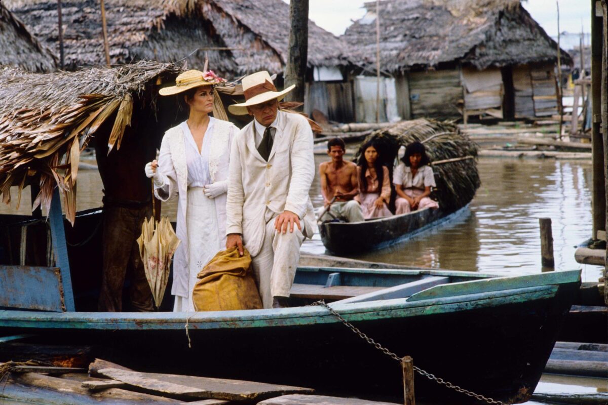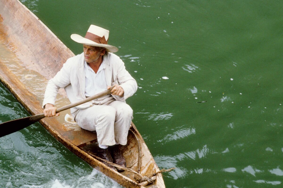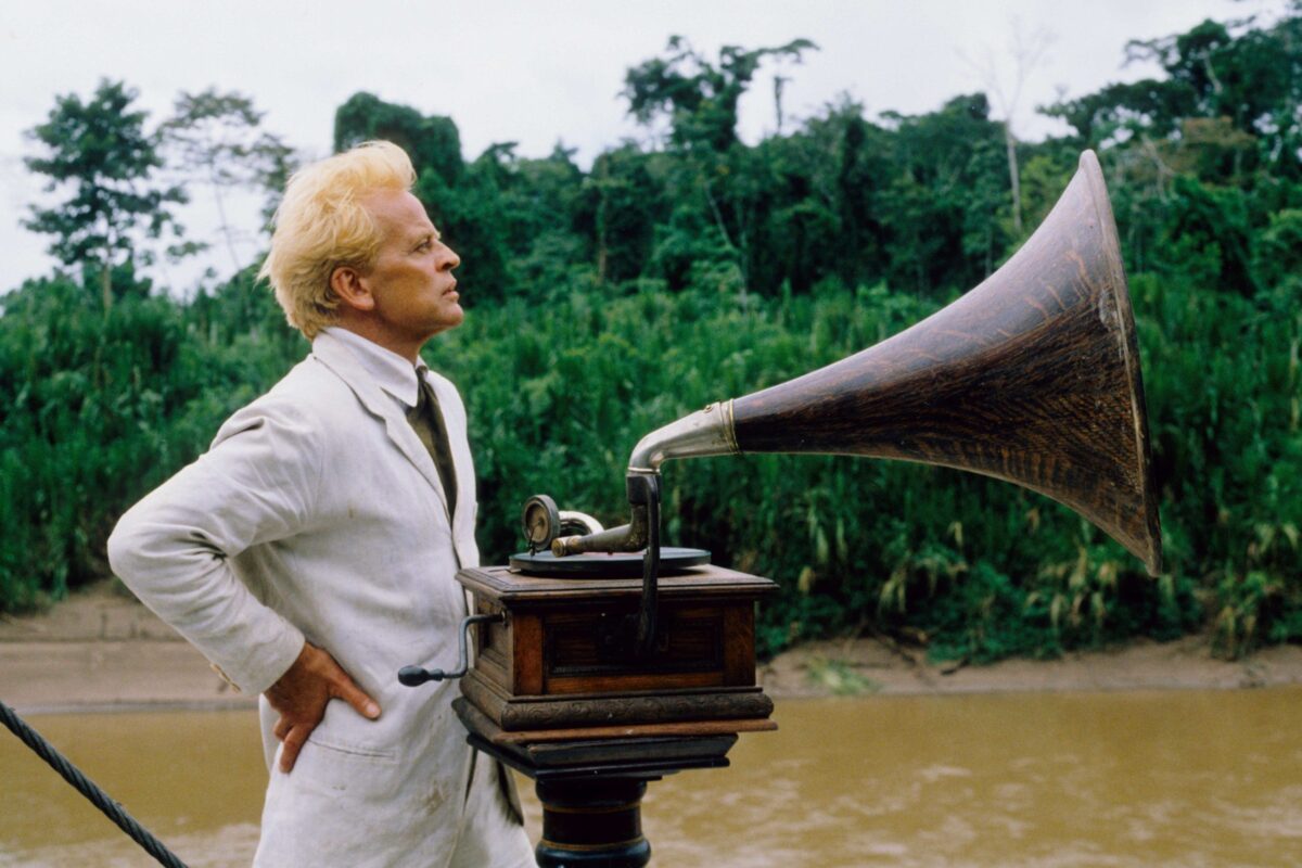 Em tela, Brian Fitzgerald é o aventureiro de sobrenome impronunciável, que os nativos optaram por chamar Fitzcarraldo. Conhecido também como “o conquistador do inútil” por, primeiro, ter fracassado no ramo das ferrovias no território andino e, agora, apostar em fazer fortuna com uma fábrica de gelo em solo tropical, o protagonista tem no excepcional Klaus Kinski uma das mais marcantes composições de personagem. Afinal, a excentricidade reverbera por cada um de seus poros, seja pelo semblante, ora atormentado, ora maravilhado, pela vasta cabeleira desgrenhada, pelo olhar esbugalhado e profundo, ou, ainda, pelo terno branco, alvura dupla a reforçar a posição de deslocado do protagonista – não apenas quando na Amazônia, mas também no mundo.