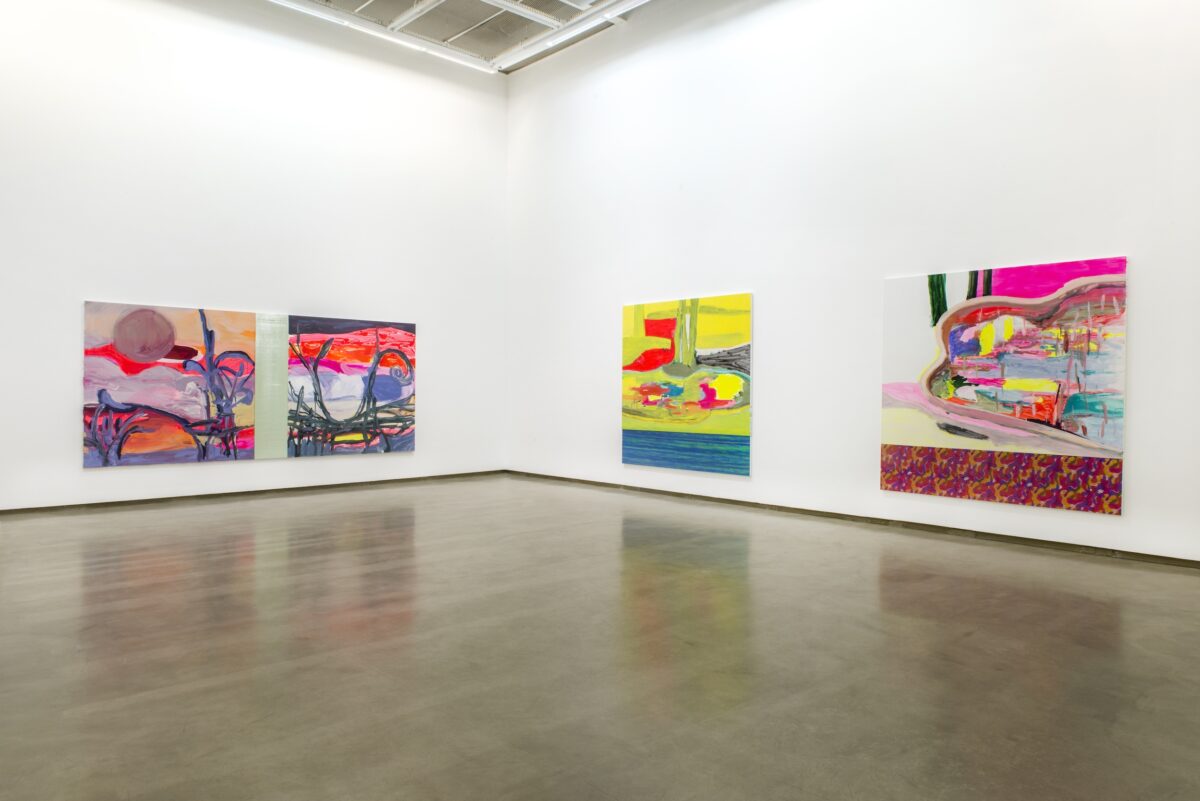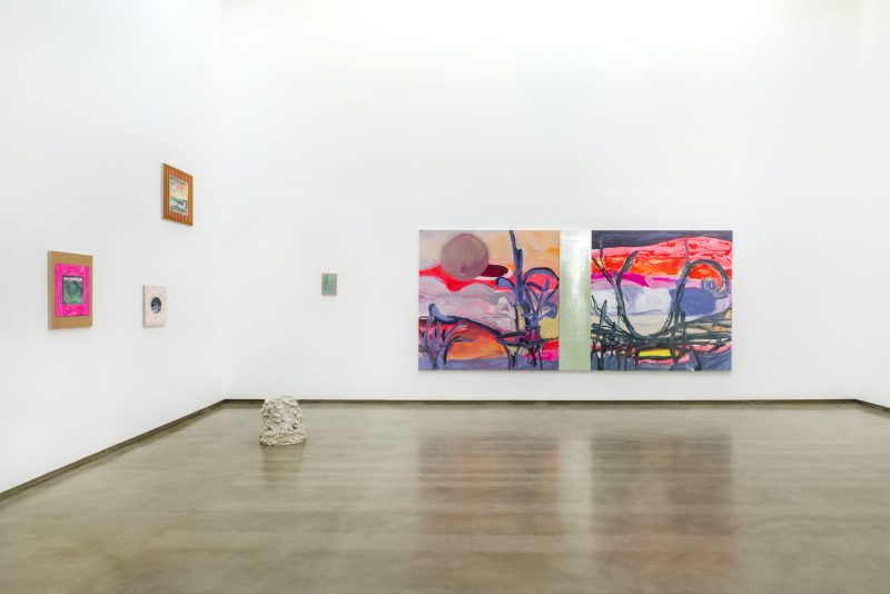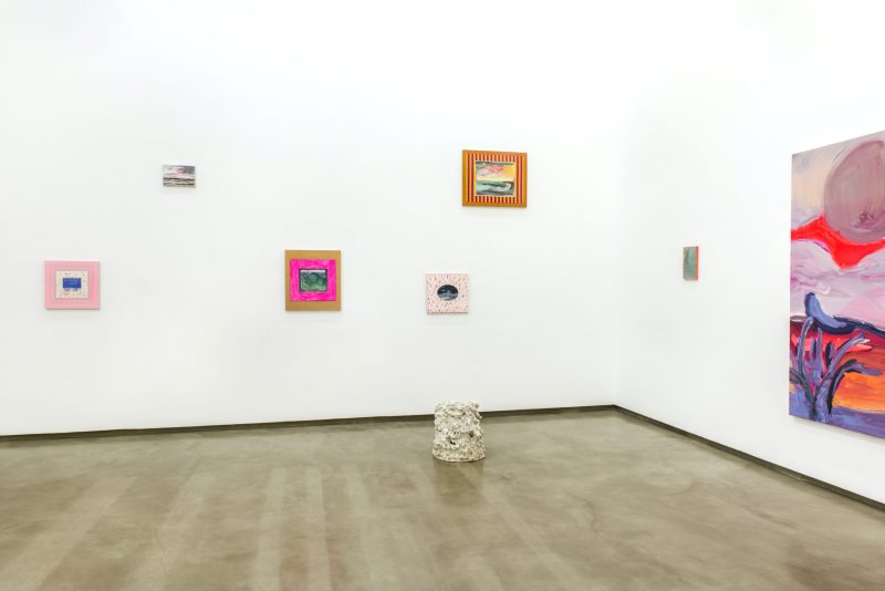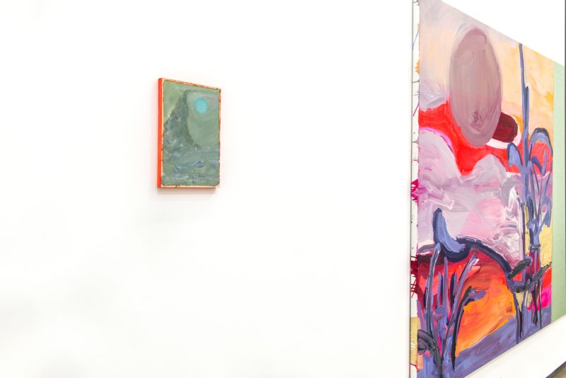 Nesta exposição, temos dois espaços: o grande, que seria a nave central da Galeria, com o pé direito alto, em que potencializei as pinturas grandes junto com as pequenas; e o segundo andar, onde apresento somente as pequenas. Construí uma narrativa, uma conversa entre elas, sem colocá-las de forma linear, na mesma altura do olho, mas deslocando-as para que se possa criar um novo olhar ao entrar na sala.
