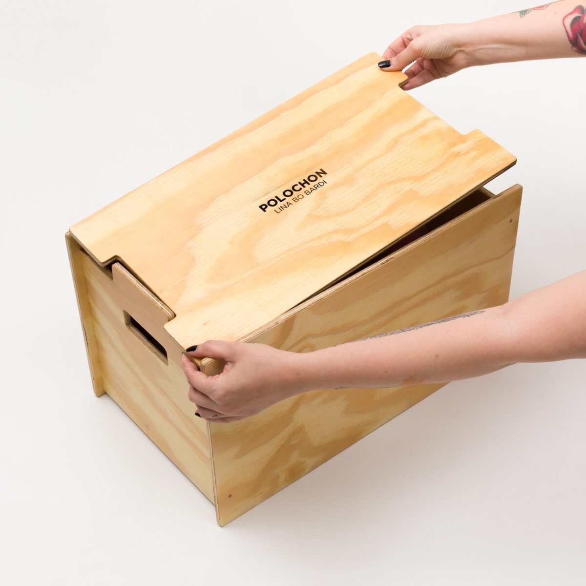 A caixa de madeira que acompanha e acomoda a edição foi inspirada nos desenhos do mobiliário de Lina. A obra ficará exposta e disponível para venda na Carbono, tanto na galeria quanto pelo site, e um exemplar também estará à vista na Casa de Vidro.