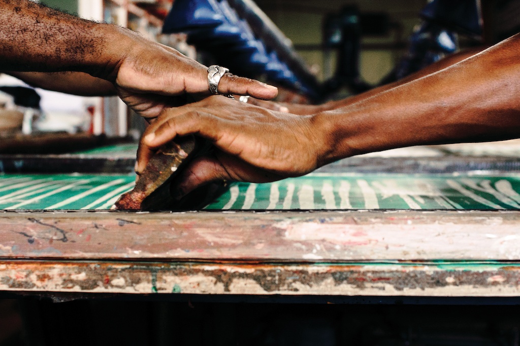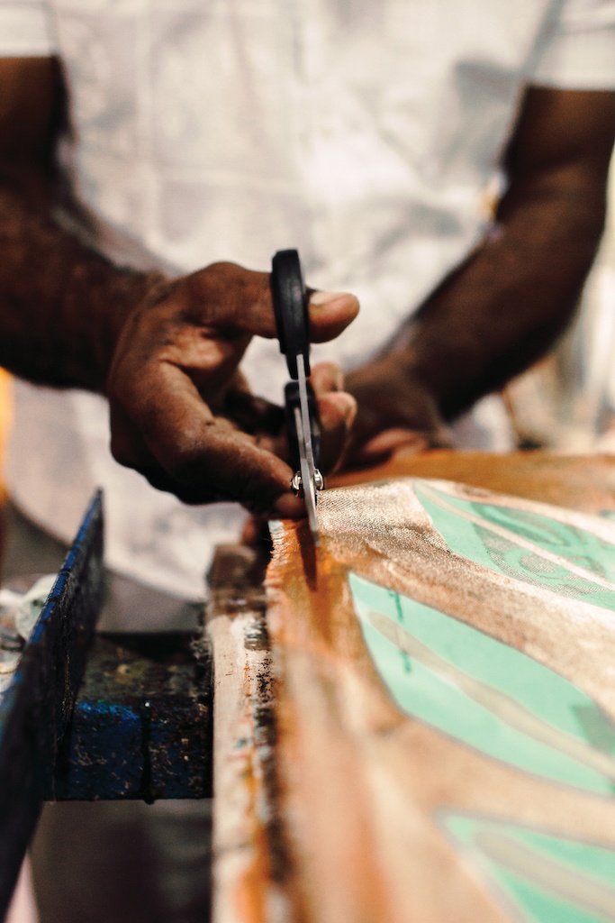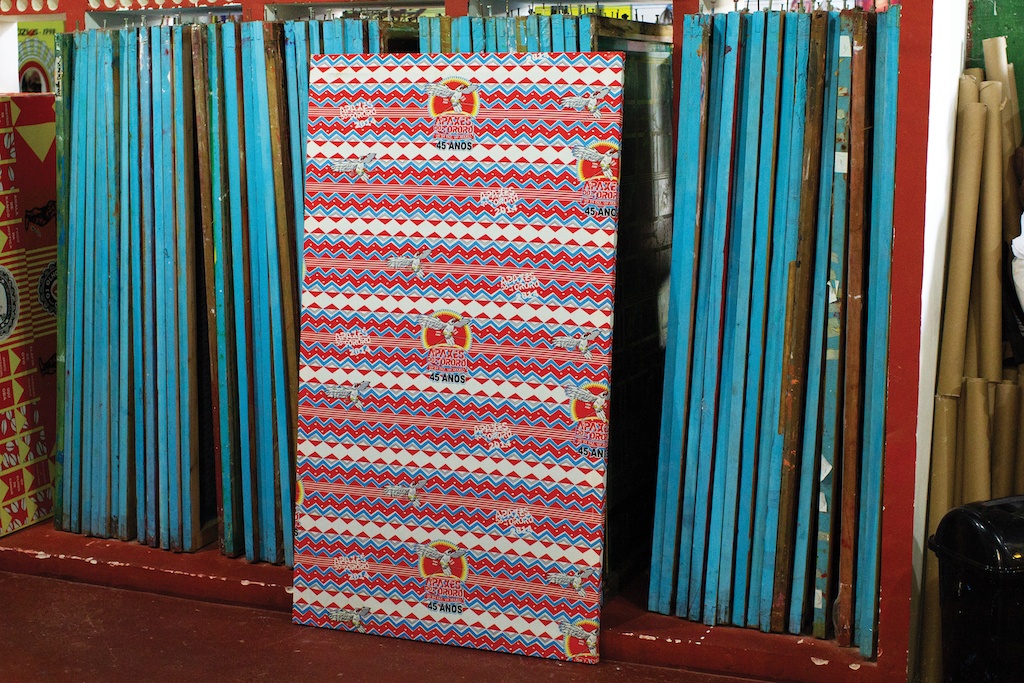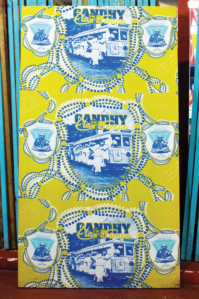 Eu estou fazendo agora um trabalho com a estilista Mônica Anjos. Ela quer fazer um trabalho com dança que vai lançar no São Paulo Fashion Week. Eu disse para ela: tenho um limite. Então eu estampo 200m de tecido com três tipos de estampa, que vão lhe sugerir movimento. Ela esteve aqui e já sugeriu outras coisas. Ou seja, seu trabalho, por si só, já causa um deslocamento estético. Eu estou com uma série que chamo de Mariwô. Primeiro, eu faço as ferramentas dos orixás e, depois, estampo o Mariwô sobre elas. Aí essas ferramentas passam a ser a coisa secundária. O Mariwô, falando de modo geral, é aquela palha de Ouricuri que fica nas janelas e nas portas dos terreiros de candomblé, que é um elemento de proteção. Essa série terá 16 orixás, criando símbolos e signos que os representam. Você pode ver, aqui, que eu sou um artista da contramão nessas coisas das telas. Normalmente usam cavaletes, sentam e ficam pintando. Eu coloco a tela aqui e faço aí. Então, se um metro de tecido meu custa R$100 essa tela aqui vai custar R$20.000.