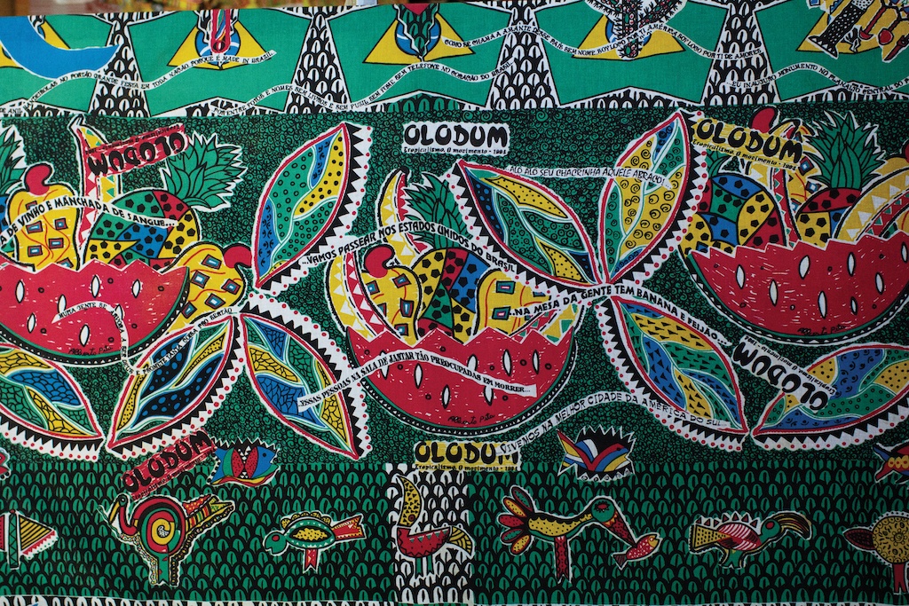 Eu acho que tem que se ter respeito em tudo que se faz. Pode ser nas religiões de matrizes africanas, de outras matrizes ou qualquer coisa na vida. E também sobre a questão da apropriação cultural, eu não tenho muita preocupação com isso. Lógico, como eu falei, tem que ter respeito. Você vê uma mulher loira com o cabelo trançado, ornado com contas, e diz “aquilo não pode, é apropriação cultural!” Eu não vejo problema, porque a questão não é ela ter feito isso, e sim eu fazer isso e ser barrado no shopping ou coisa semelhante, por conta da minha estética, e ela não. Então é esse equívoco que temos que combater, e não o fato de as pessoas usarem as cores, saírem com uma roupa nas cores do Ilê Aiyê, com o cabelo trançado, sendo pessoas brancas. Acho que a conversa é outra. Até porque você vai no Centro Histórico e dezenas de turistas o tempo todo estão fazendo tranças com as trançadeiras negras, que sobrevivem disso. Porque dificilmente vai aparecer uma preta e sentar ali para ser trançada. As pretas trançam seus cabelos em casa. Elas já se conhecem, ligam ou vão até sua trançadeira e já têm quem pega na sua cabeça. Porque nem todo mundo gosta que qualquer um pegue em sua cabeça. Mas as pessoas brancas não estão nem aí. Eles se interessam pela estética, vão lá, sentam, pagam cinquenta, cem reais, e a trançadeira resolve a vida. Como é que você conta essa dita apropriação cultural? A mesma coisa digo dos tecidos. Eu estampo em tecido, e um metro de tecido meu é caro! O de Goya Lopes é caro, a arte de J. Cunha é cara. Então, se você pode comprar, você vai comprar. Por que eu vou fazer só para negros comprarem meu tecido e vestir? Não. Quando eu faço, eu quero vender. Porque aí eu sei que vou poder fazer mais. Vou poder fazer mais coisas. Então tem o interesse comercial. É você aprender a lucrar em cima da arte. Caetano já fala isso na música. Se você ouvir o álbum O Sorriso do Gato de Alice, tem um trecho da canção “Bahia, Minha Preta” que fala isso: “Vender o talento e saber cobrar, lucrar”. Tem que entender até onde vai o limite dessas coisas.