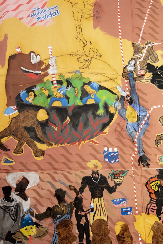 O grande formato de suas pinturas também tem a ver com isso. “Achei pertinente assumir esse formato de pintura monumental, para intensificar o diálogo entre a quantidade de papel articulada e o número de corpos pretos em posições contemporâneas de poder”, escreve em texto publicado no catálogo da exposição Pardo é papel. Para quem teve a oportunidade de ver tais obras ao vivo, fica evidente o contraste criado pela monumentalidade das obras e a fragilidade do material, que acaba tendo rasgos e remendas aparentes, algo que foi pensado propositalmente pelo artista.