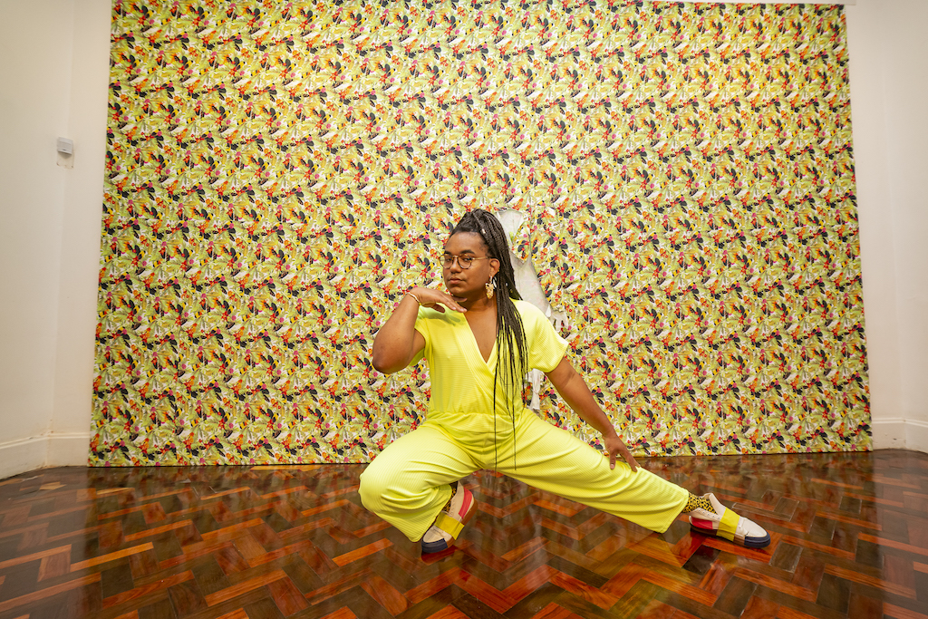 Sou um(a) corpo(a) alienígena às normas comportamentais do Sudeste, da branquitude acadêmica e dos processos de embranquecimento. Já atravessei muitas fases até me afirmar politicamente como bixa preta. Entendo a importância de ter iniciado minha carreira artística nas escolas de samba de Belém, de não negar as referências visuais, cores, performatividades e sonoridades que aprendi com as deusas do samba e do axé. Há alguns anos, venho pensando na ideia de festa como potência estética, como lugar de encontro e afirmação política. Em 2022, completo nove anos ativos e ininterruptos no carnaval das escolas de samba do Rio de Janeiro, atuando desde 2018 como destaque em carros alegóricos. Atualmente, desfilo pela escola de samba Grande Rio e busco em referências como Piná e Jorge Lafond uma investigação sobre a memória de corpos(as) pretas e performáticas em carros alegóricos.