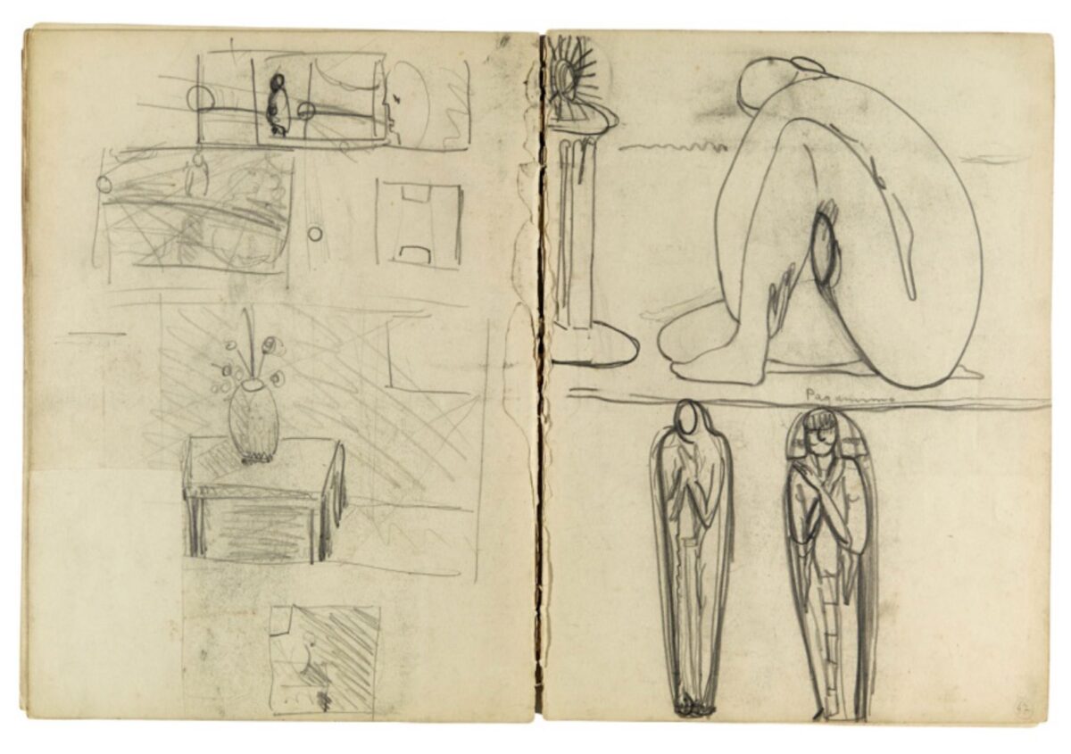 (Atenção ao desenho do topo direito, que se assemelha ao Abaporu de Tarsila. Há, inclusive, a presença do sol)