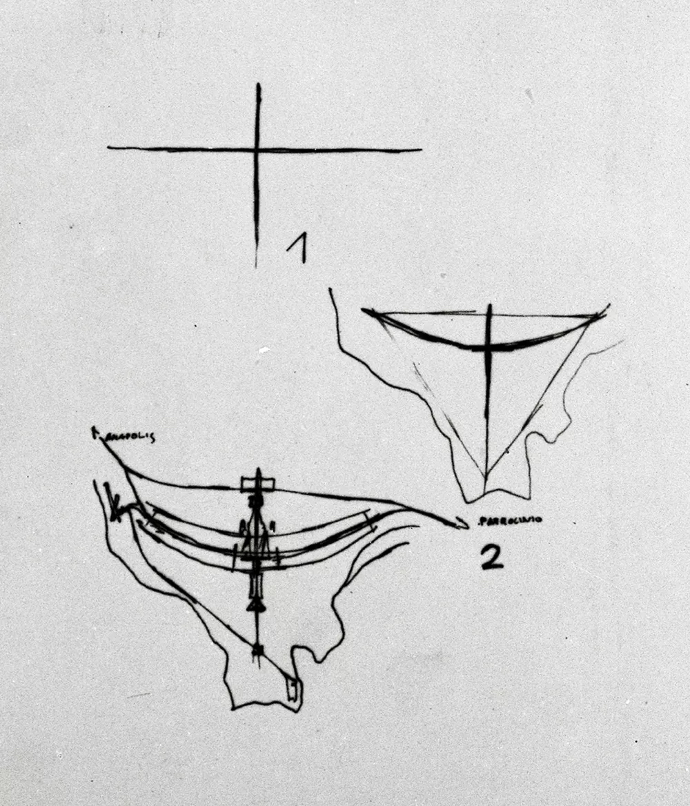 Talvez o primeiro ato arquitetônico colonial tenha sido justamente a cruz fincada na areia, em Santa Cruz de Cabrália, no ano de 1500. 457 anos depois é fincada uma cruz na futura Brasília, a 1.172 metros de altitude, no canteiro central do Eixo Monumental. Nesse ponto mais alto da cidade, foi realizada a Primeira Missa da nova capital, em 3 de maio de 1957. Mais de mil pessoas participaram dessa celebração que marcou o batismo da nova capital.