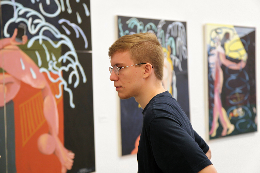 Esta conversa foi feita em duas partes. A primeira aconteceu na exposição Choro, de Antonio Kuschnir, durante uma visita presencial guiada pelo artista. Com generosidade, Antonio foi compartilhando a subjetividade das imagens, tela por tela. É a primeira vez que ele faz uma exposição tão grande. Aos 21 anos, é o artista mais jovem a ocupar o Museu de Arte Contemporânea de Niterói.