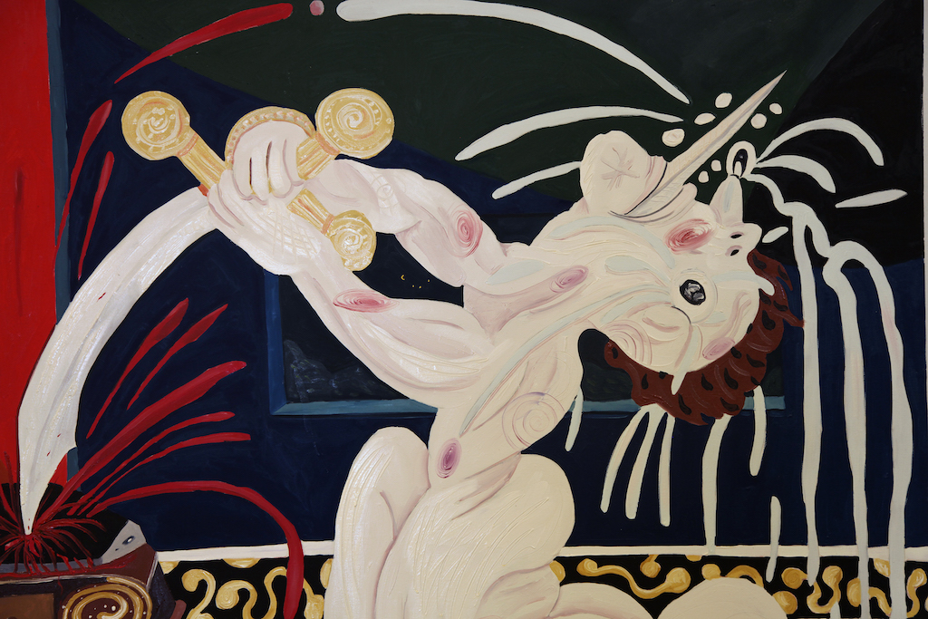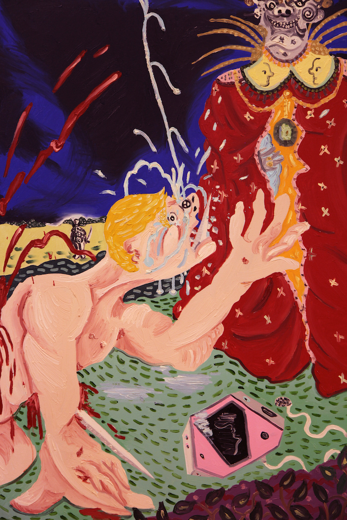 A destruição é, primeiramente, autodestrutiva. Essa língua com a lâmina mostra isso, né? Por mais que você tente perfurar alguém, antes você será perfurado. Eu gosto muito de olhar para a história, para o que já foi feito. Assumir isso. O Matisse é minha inspiração suprema, e ele nunca pintou uma cena violenta. Uma vez, ele foi chamado para pintar uma cena de violação, mas não conseguia resolver a imagem. Também me comovo muito com Bourgeois, Picasso, Portinari, Goya, Rubens – estes últimos representaram a barbárie muito bem.