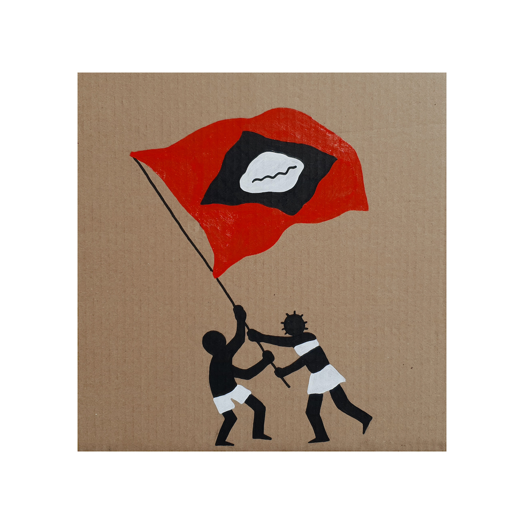 A partir daí, veio o convite para o artista inaugurar uma nova galeria localizada dentro da biblioteca do MAR. Em 2019, Mulambö realizou Tudo nosso, sua primeira exposição individual. A mostra apresentou trabalhos de quase todas as fases do artista até ali, entre elas a série que era então a mais recente, Armas (2019). Um conjunto de pequenos desenhos feitos com guache sobre papelão. São personagens da vila, da praia, do carnaval. Corpos pretos com roupas brancas, sem rostos, munidos de seus objetos cotidianos, suas armas de resistência. Um conjunto de obras que deixava claro de onde vinha, com quem se comunicava e o quanto precisava ser ouvido.