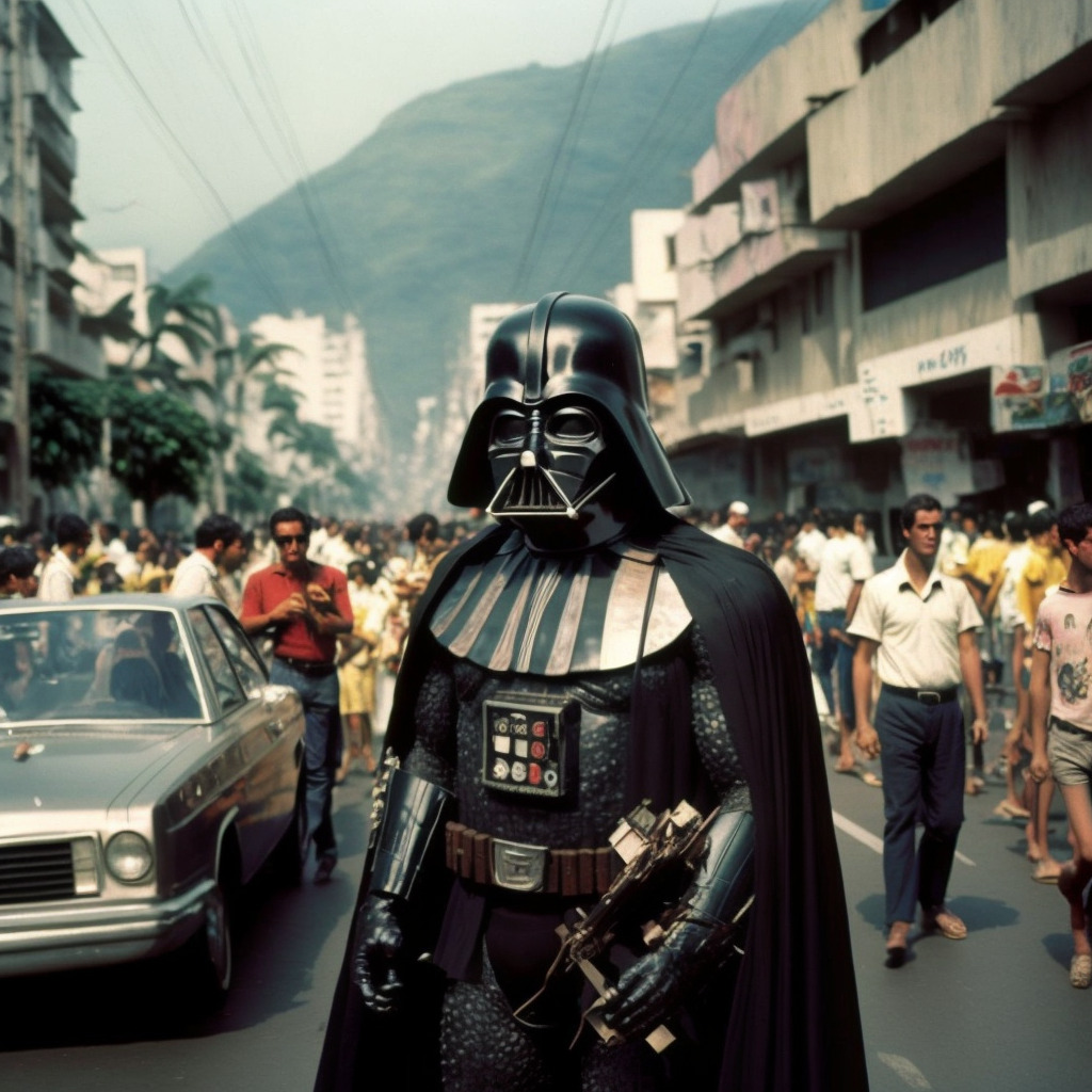 O que aconteceria se o pessoal do Guerra nas Estrelas viesse passar um carnaval no Rio nos anos 60. Essa é a legenda que, acompanhada de uma imagem de Darth Vader em plena folia carioca sessentista, inaugura a série Carnavais Artificiais. Com a ajuda da inteligência artificial, o artista multiplataforma Pedro Garcia de Moura imagina carnavais que não aconteceram, mas que, a partir da geração feita por ferramentas digitais, ganham todo o vigor que nunca tiveram. Uma foto na Praça Paris tirada com o celular (postada previamente no perfil Cartiê Bressão) ganha a estética pixel art dos jogos de Super Nintendo e MegaDrive; um registro feito no aterro do Flamengo ou no Cordão Umbilical do Humaitá ganha os traços totorianos típicos do estúdio Ghibli.