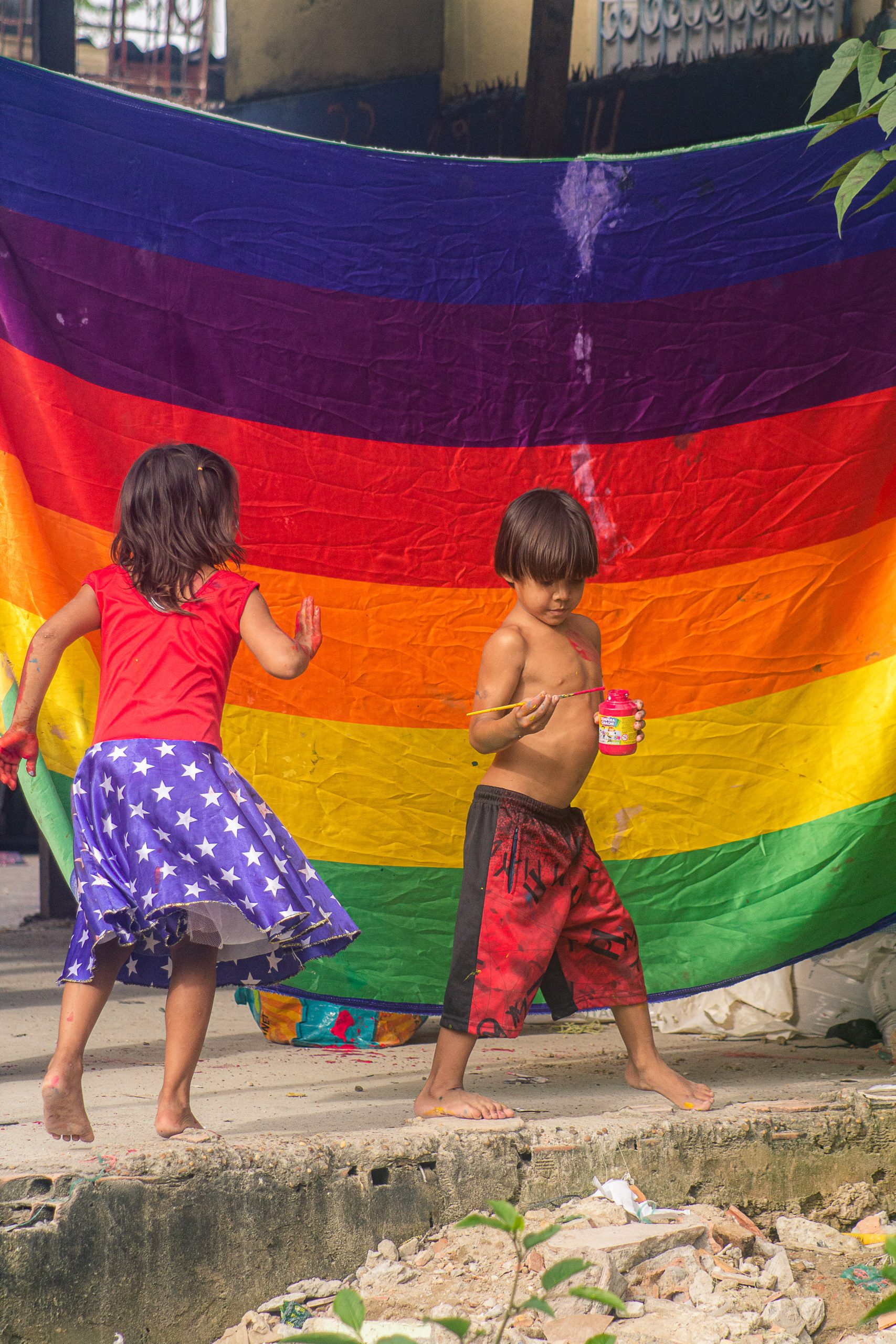 Gabriel: Na rua pintando o campinho, pintando a bandeira do Brasil, pintando a bandeira gay, pintando a camisa do Brasil.