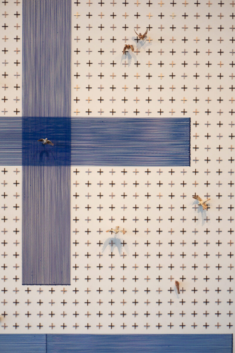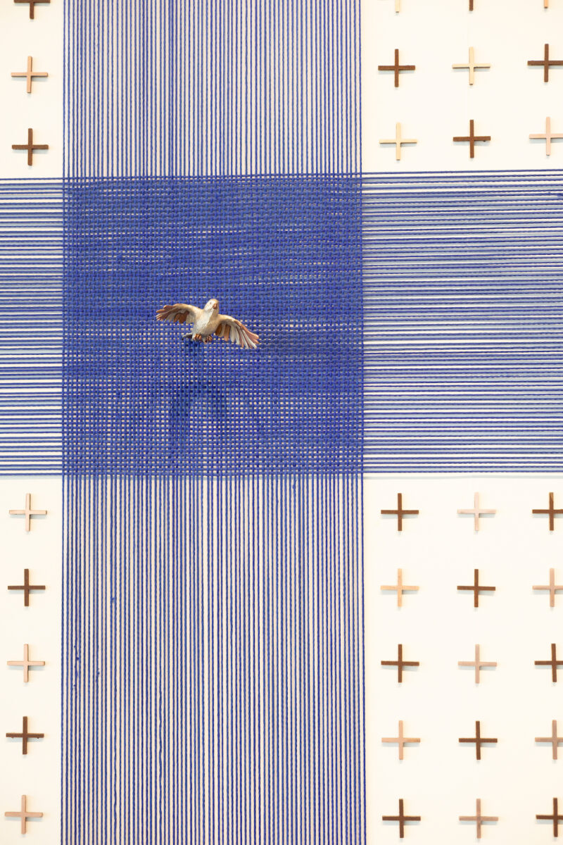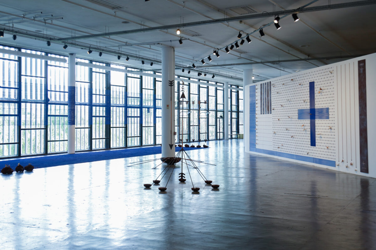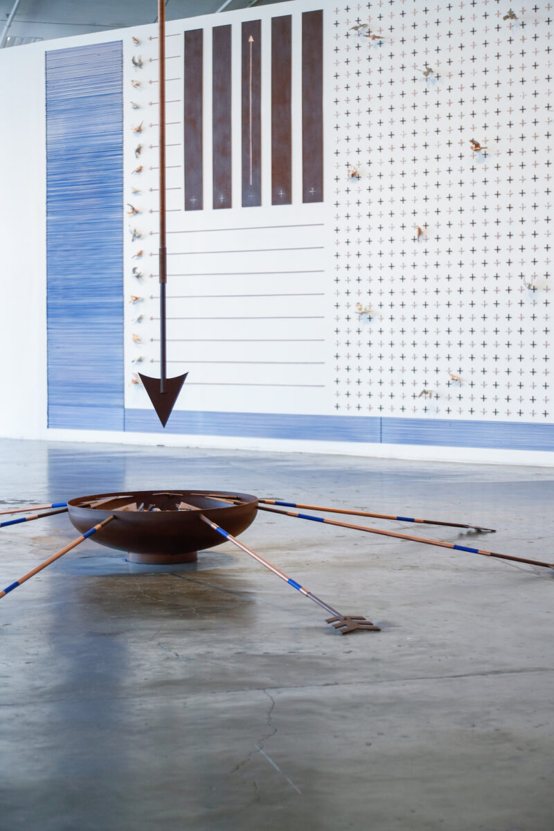 LV: A comunicação do meu trabalho é elementar, é como uma tabela periódica. Vou para esse lugar mais puro da matéria, porque talvez seja nesse lugar em que está a comunicação de uma voz inaugural. Quando escolho essas matérias, tudo está muito ligado à comunicação do elemento. Esse é um trabalho que traz uma história muito densa, mas é possível sentir a criação de uma outra rota para essa densidade. As ervas vêm nesse sentido, de conduzir para um outro lugar; o anil aparece no sentido de limpeza; e as flechas são vetores, ações dos movimentos do trabalho. Nada de se dá por acaso.
