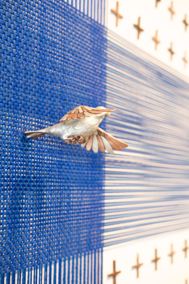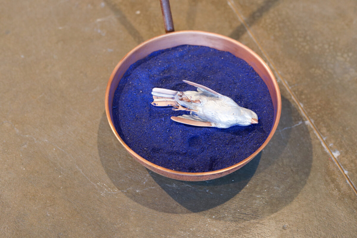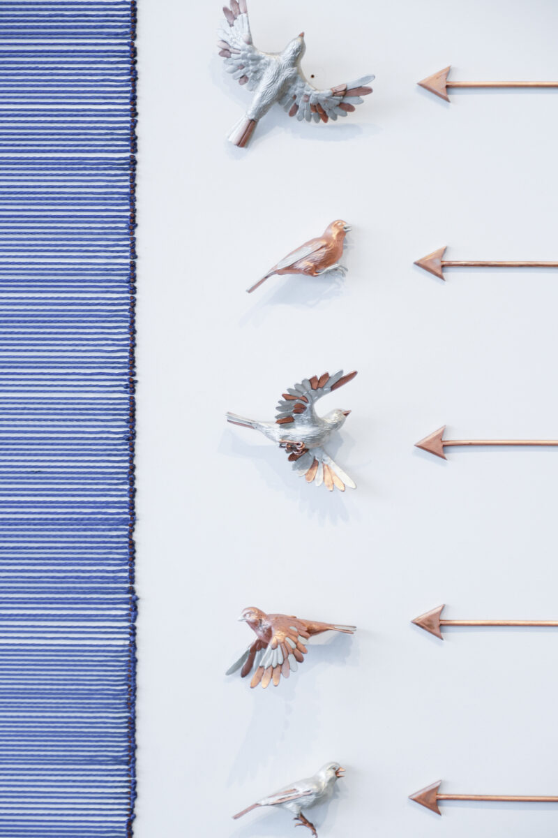Em Pulmão da Mina utilizei a prata e o cobre no corpo dos pássaros pelo fato deles serem os dois metais mais condutivos. Para mim o ar é um veículo de condução de informação. A partir desses metais condutores, o ar se faz presente na obra, e ao mesmo tempo, a presença do ar é um aspecto importante dentro da movimentação de liberdade de um corpo negro. A fuga que vem dos elementos é uma possibilidade de entender a química dos acontecimentos, e esse movimento de entender como a história pode ser contada a partir de movimentações químicas me interessa.
