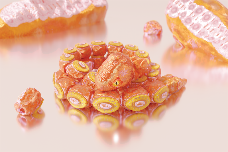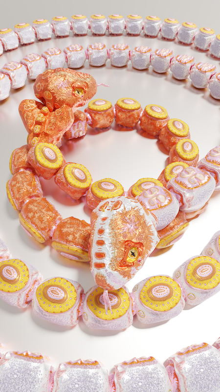 Minha intenção era criar algo moldável, que existisse em diferentes formas e lugares. Ao fazer um recorte em São Paulo, busquei a conexão entre a Bulgari e a cidade, entre a Serpenti com São Paulo. Descobri, então, que há uma espécie rara de jiboia em São Paulo, que ressurgiu após anos, mesmo com desmatamento significativo na região. Isso me intrigou, pois São Paulo já foi um encontro de diferentes biomas, modificado pelas mãos humanas ao longo do tempo. Para construir o misticismo da serpente baseado nessa raridade, fiz testes com diferentes cores, inspiradas na paleta da marca. A serpente foi composta por partes separadas, como cabeça, peito, rabo e corpo, sendo possível adicionar mais peças, como um colar ou um bracelete. E também queria brincar com o imaginário brasileiro, remetendo às serpentes de um real que moldávamos na infância, dando uma perspectiva luxuosa e rara. Assim, nasceu o símbolo da serpente, que se tornou o foco do evento de lançamento da colaboração e se expandiu por diversas formas, incluindo escultura digital, pintura, animação 3D, projeções de videoarte online, e NFTs. Estamos construindo essa colaboração explorando novos territórios e possibilidades..