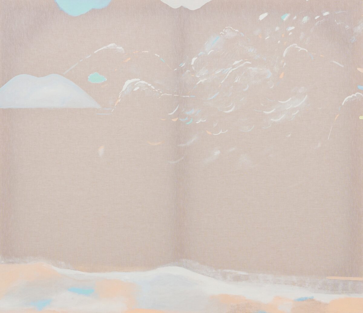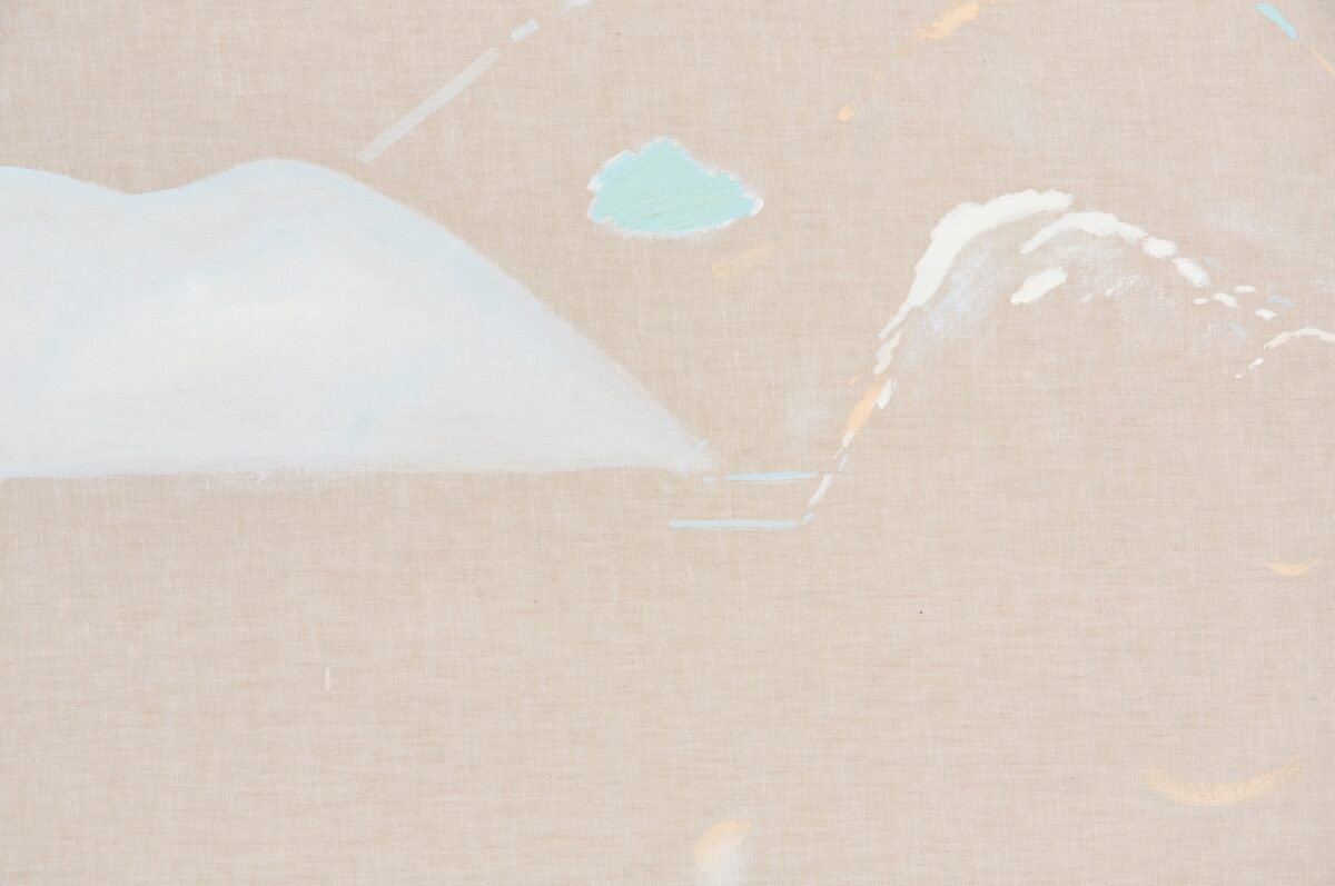 Há, ainda, um terceiro procedimento da artista, que, não contente com a dureza do linho, suspende suas pinceladas em delicadas tramas de voil que exibem o seu próprio chassi. Aqui, a construção simbólica da cena como paisagem se desconstrói em alegres e rápidos traços de tons pastel, desvelando àquele que vê o intrínseco artifício da ilusão. Curiosa dicotomia, já que faz desmantelar a qualidade ilusória oriunda de uma tradição pictórica realista comum ao gênero de paisagem, tornando-o opaco como materialidade e enunciado cultural mediante o uso de um anteparo translúcido que revela a sua estrutura. É em um gesto tão sutil e repleto de beleza que, com ele, Yasmin atesta não se atrelar a uma herança ocidental que buscava o domínio do seu entorno pela apreensão visual do mundo, mas em sua experiência estética sensível. Tão modesto quanto espirituoso, o óleo se despe de sua seriedade e flui como o vento, embarcando na onda de sua criadora.