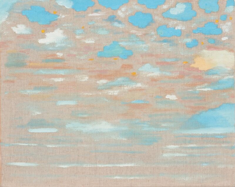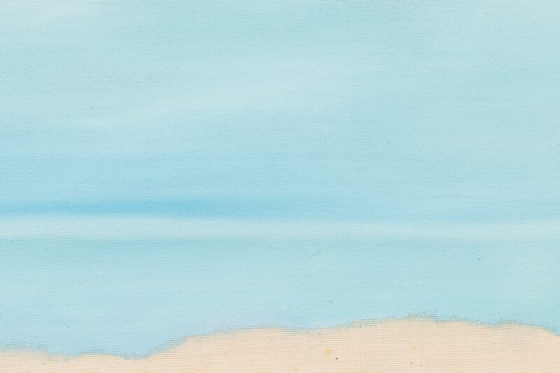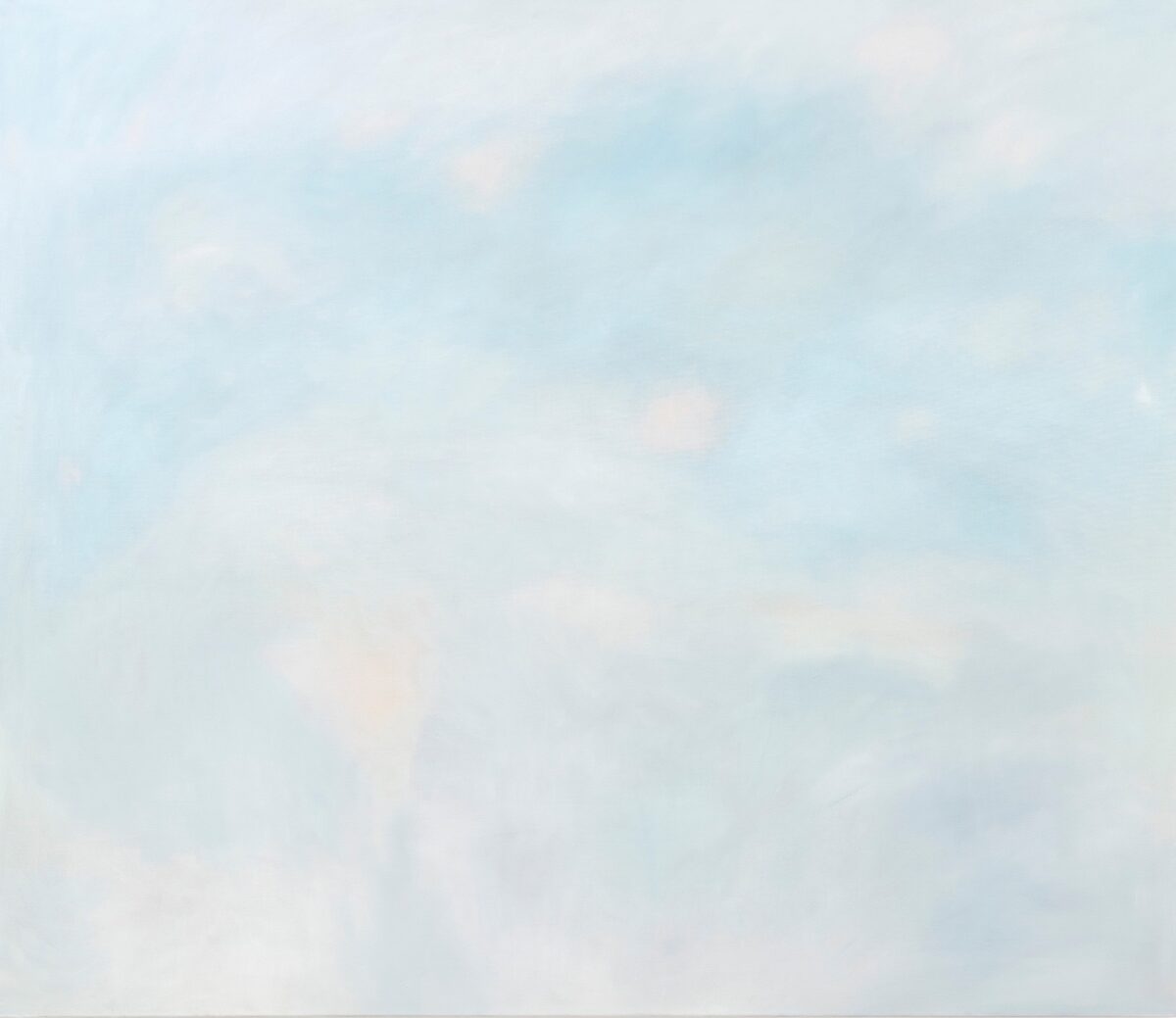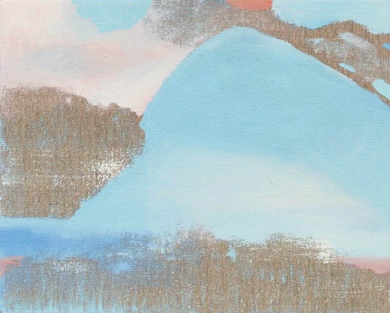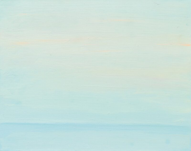 Das maneiras com as quais Yasmin tece novos horizontes, há três procedimentos que eu gostaria de explorar neste ensaio crítico, pois não denotam necessariamente fases de sua jovem produção pictórica ou escolhas conscientes, mas modos de encarar o vazio que podem ou não coexistir em uma mesma obra. Na primeira delas, a cena se constrói por camadas de tintas que adensam a tela em gradações que variam sutilmente entre tons. Formam uma espécie de nevoeiro cujos movimentos de cor circulam pela superfície em ritmos por vezes serenos (quando funcionam como fundo ou como objeto de reflexão), por vezes enérgicos (ao serem delimitados por bordas acachapantes). Nessas ações, a artista contempla o horizonte pelo acúmulo de sensações retinianas que apreendem, como metonímia, a parte pelo todo — a impressão de um conjunto de cores em tênue variação para aludir à elaboração de uma cena. Cena-paisagem, decerto, mas apenas ancorada à vaga lembrança subjetiva daquele que a vê, pois nenhuma das telas carrega, nem em seu título, nem nas anedotas de sua criadora, a referência a um externo.