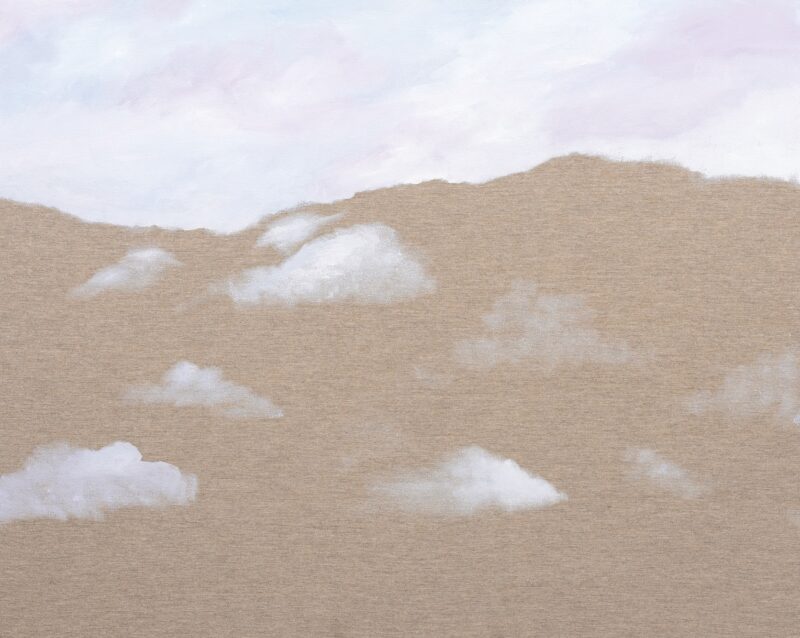 Em outro gesto, Yasmin representa uma divagação poética das qualidades imateriais da natureza por meio de um trabalho de subtração. Nessas pinturas, um certo pontilhismo solto é utilizado, de modo a criar rastros de cor que ora se concentram em partes da cena, ora deslizam pela superfície, podendo ou não extrapolar os limites da tela. Em pontos de cor, raramente sobrepostos de maneira direta, a artista ambiciona representar o vento, a fina camada de cor que recobre as bordas de montanhas e vales, gotículas de chuva ou até formações de nuvens — estas últimas feitas em gestos rápidos de tinta molhada ou em fricções do pincel encharcado em óleo quase seco. A coreografia das partículas varre a pintura de forma enérgica, condensando fenômenos naturais complexos em zonas de cor que fluem pelo espaço pictórico. Dão a ver o fundo cru do suporte, geralmente em linho de cores variáveis, sobre o qual Yasmin propõe uma interação entre a fibra vegetal e os motivos de suas cenas.