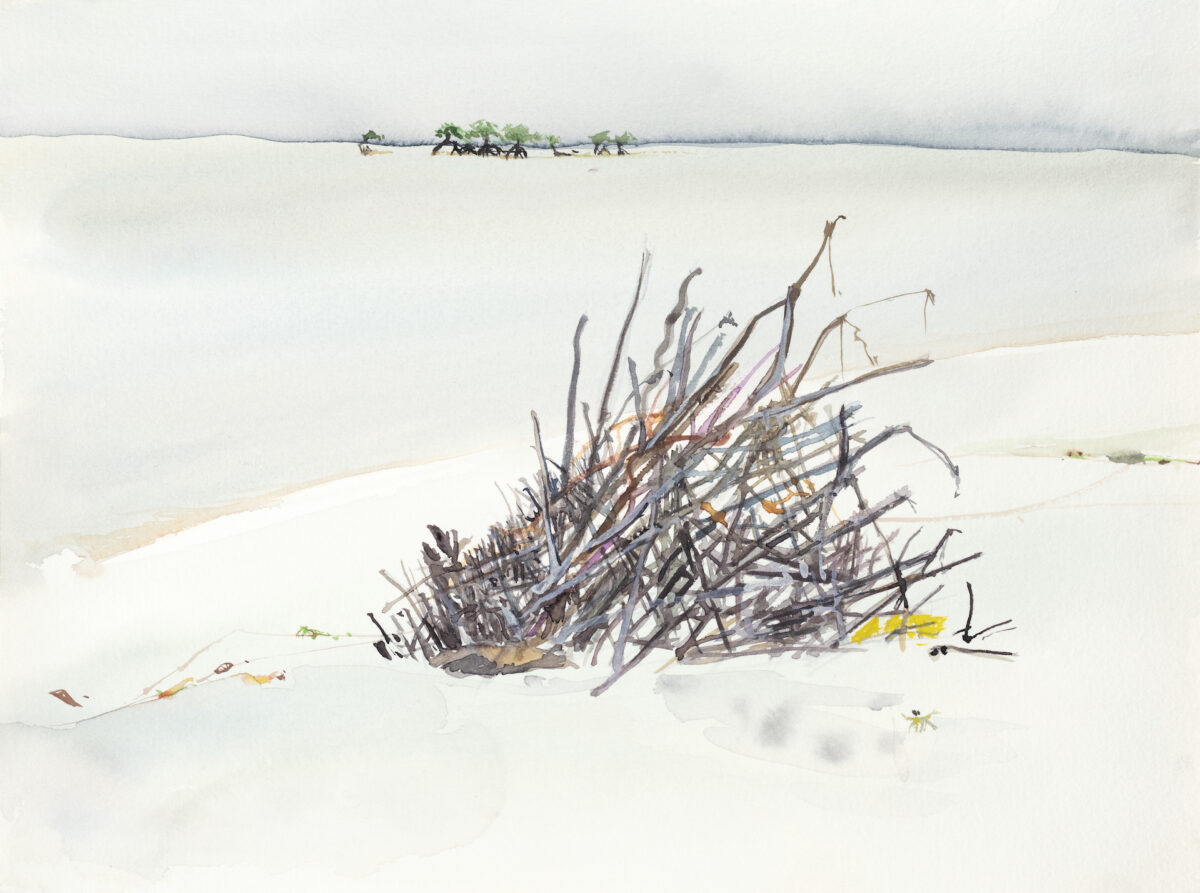 “As paisagens”, comenta Diniz, “são compostas pelo que se revela aos olhos, mas também por sons, temperaturas, texturas, cheiros, dentre outros aspectos sensíveis que são radicalmente irredutíveis ao olhar. Há, ainda, presenças da ordem do invisível, como memórias, fungos, espíritos, etc. Nesse sentido, para ‘representar’ paisagens — ou, talvez mais precisamente, evocá-las —, Zerbini tem recorrido a estratégias que vão além do naturalismo do cânone europeu do gênero da paisagem. Sua obra tem se aproximado cada vez mais de problemas tais quais: ‘como evocar o vento?’, ‘como testemunhar, na pintura, a inseparabilidade dos muitos seres que compõem uma mata?’, ‘como fazer ressoar o som das folhas?’, ‘como tangenciar a luz que faz tudo vibrar?’, e por aí vai… Para lidar com esses problemas, o artista tem experimentado e inventado formas de representar que vão além da perspectiva linear, da distinção entre figura e fundo, da matização cromática, dentre outras prescrições naturalistas.”
