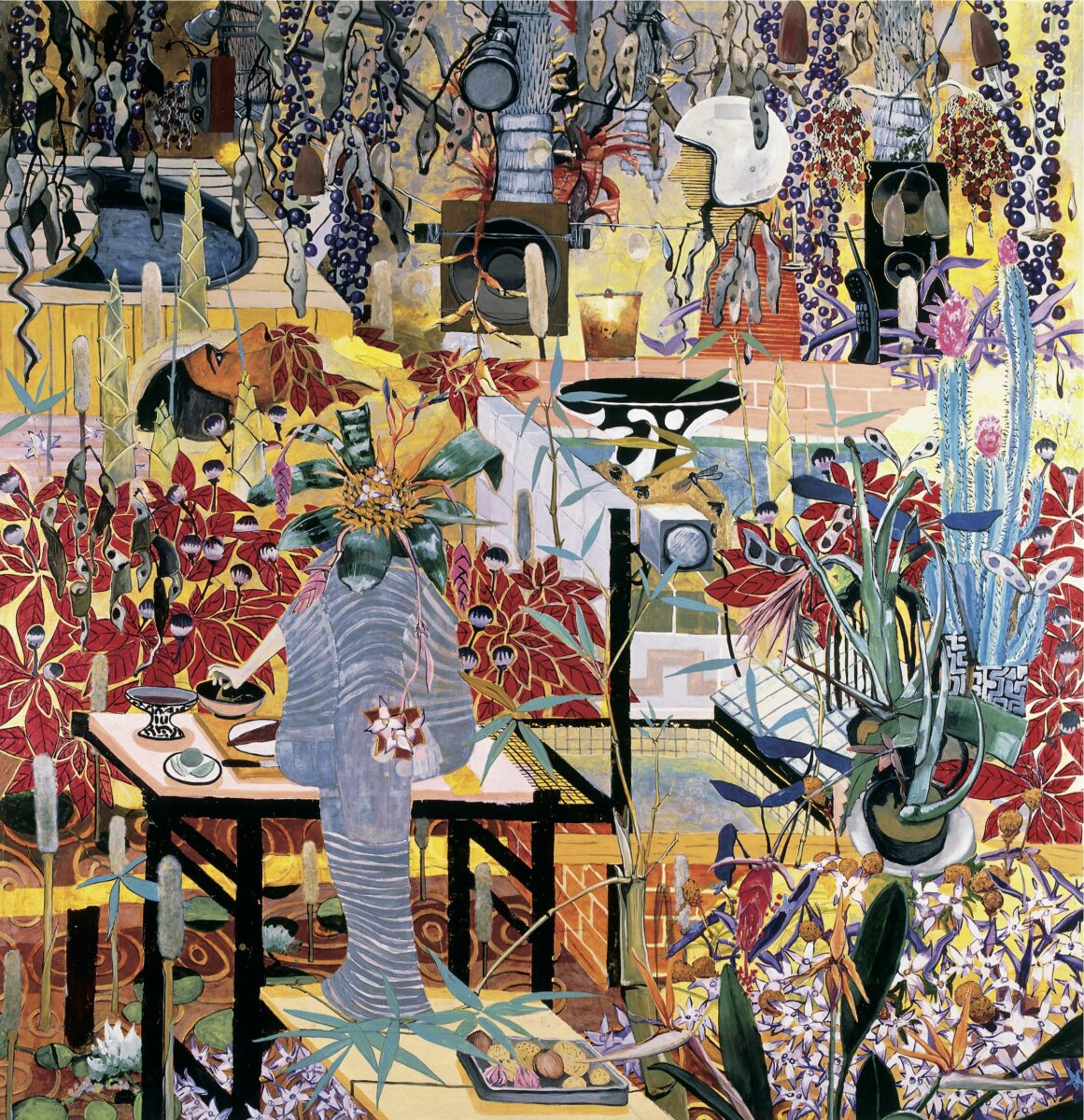 “Como a paisagem é um conceito sociocultural”, comenta a curadora, “os paisagistas estão implicados num exercício interpretativo que é atravessado por transformações não apenas subjetivas, mas também sociais, públicas, históricas e políticas. Com Zerbini não foi diferente. Se nesses 50 anos de trabalhos vemos o artista amadurecer em âmbito pessoal, é também verdade que sua obra e o mundo que ela rumina igualmente se adensaram, abraçando um número cada vez maior de camadas, nuances, interesses, compromissos. Suas estratégias formais e plásticas — bem como seus assuntos e ambições — se transformam continuamente, não numa linearidade evolutiva, mas em espiralados desdobramentos. Um exemplo desse movimento é a dimensão alegórica de sua obra, aspecto presente nas icônicas obras em que, já nos anos 1980, retratou seus amigos artistas, e que foi, mais recentemente, retomada e transmutada na forma de alegorias históricas.”
