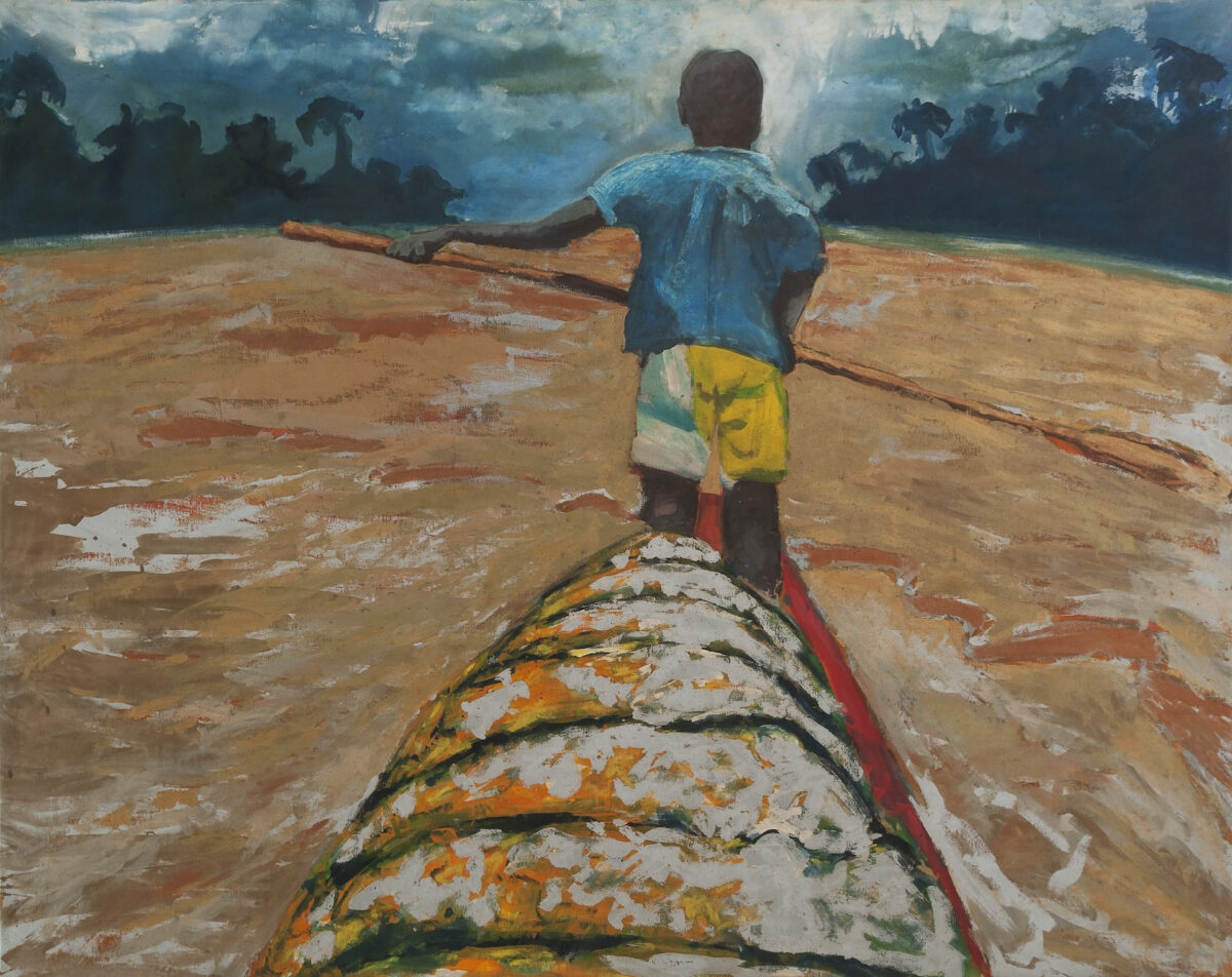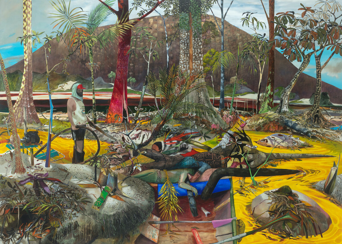 No terceiro núcleo, “da natureza alegórica da paisagem: Massacre de Haximu e Primeira Missa”, a retrospectiva destaca a vocação histórica da ruminação paisagística. As pinturas alegóricas revisitam a história brasileira, combinando signos e personagens em grandes composições que desafiam narrativas oficiais e avivam memórias de resistência e insurgência. As obras que dão nome ao núcleo, Massacre de Haximu (2020) e Primeira Missa (2014), confrontam iconograficamente a violência social que caracteriza a constituição colonial do Brasil, oferecendo uma leitura crítica e renovada da história nacional.
