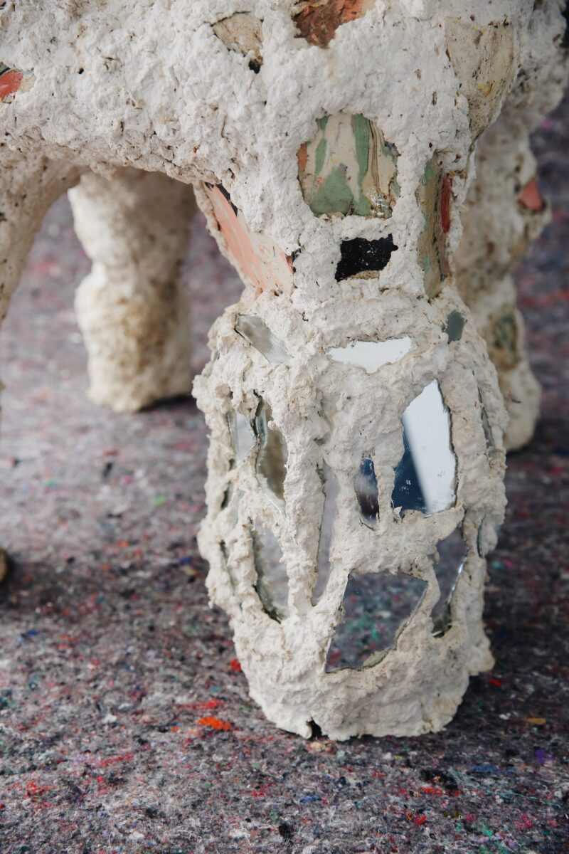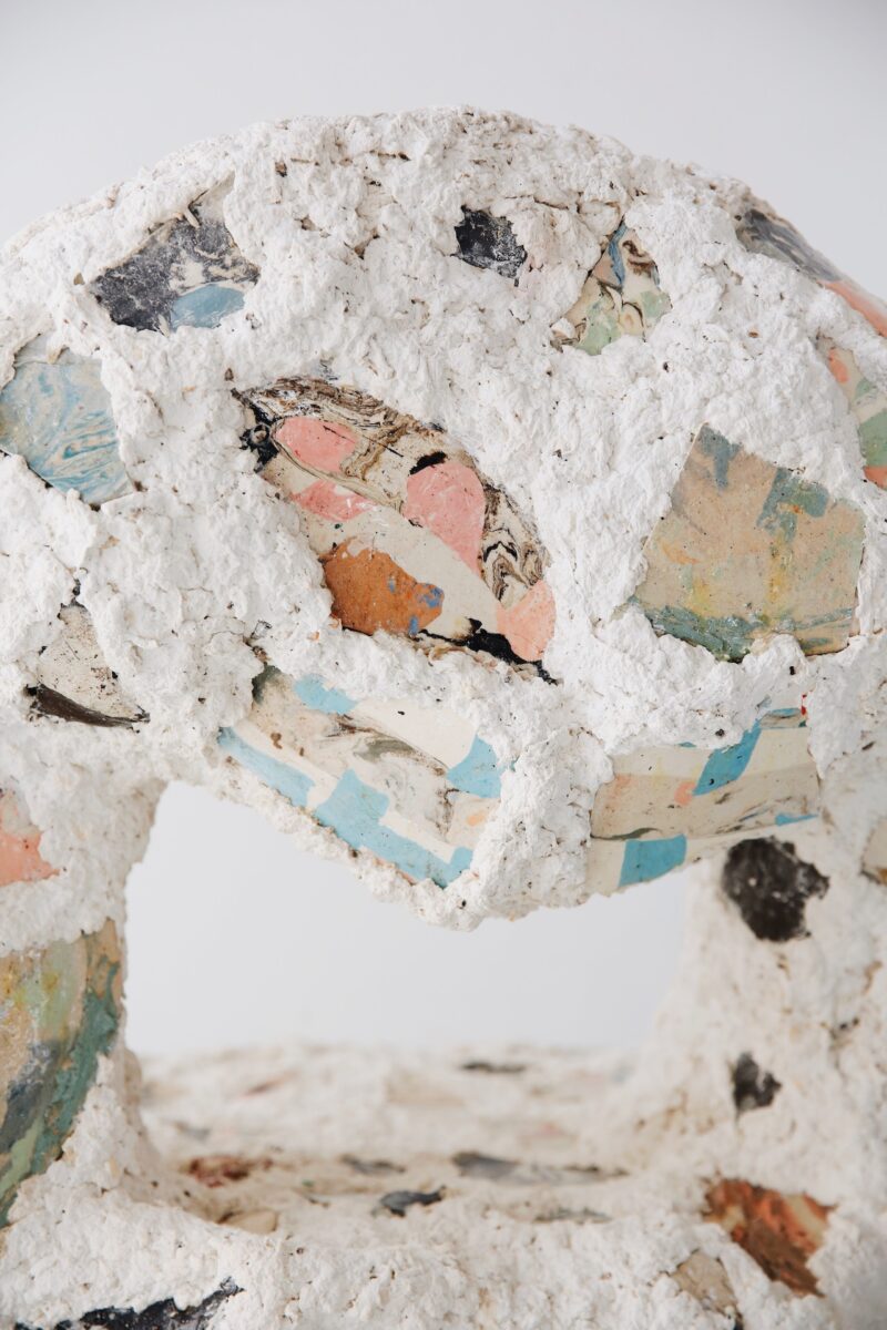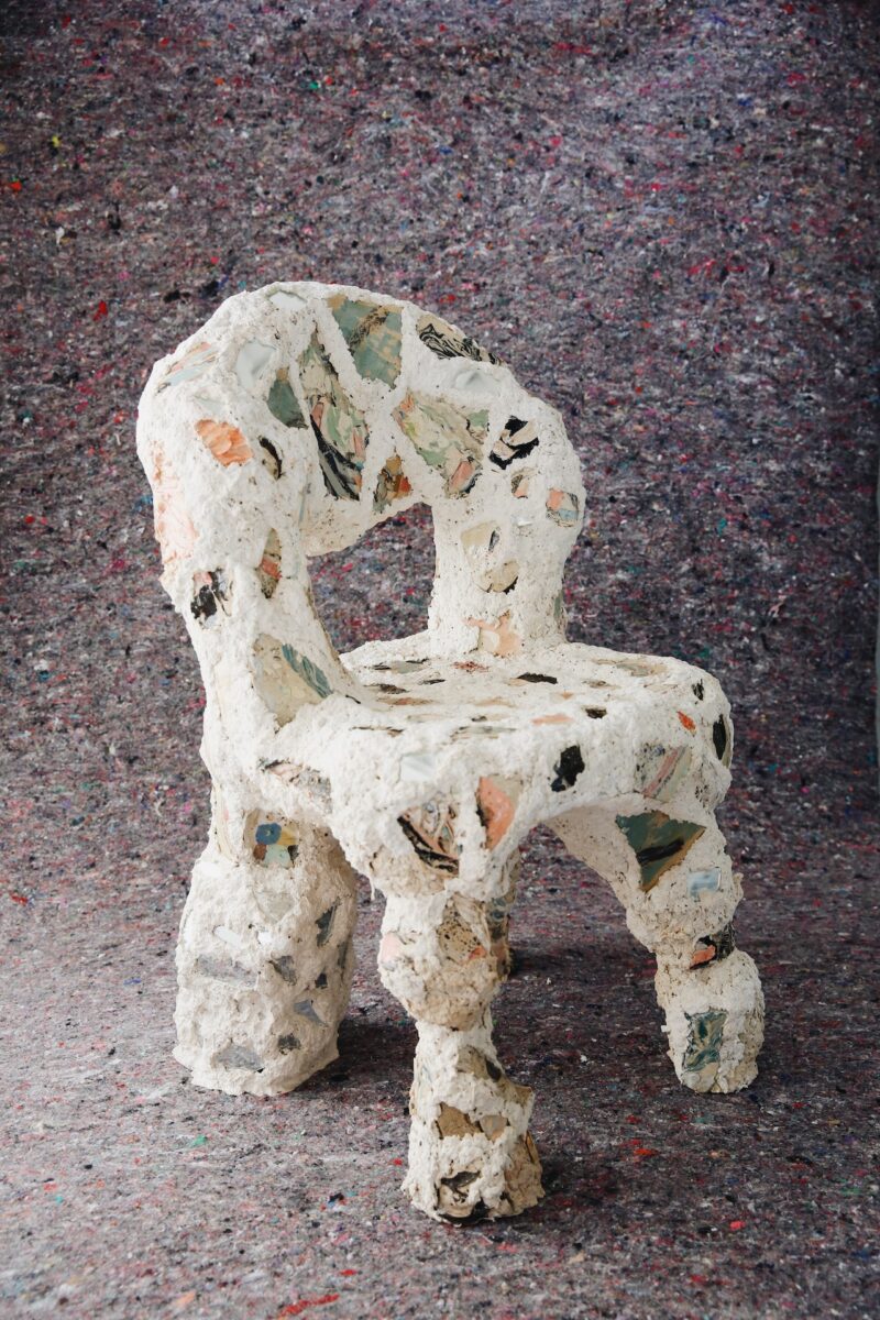 AM: Foram conceitos que guiaram todo o processo de criação e estão presentes tanto na base da cadeira, que foi garimpada e deformada, quanto na massa de celulose reciclada e nas cerâmicas que foram usadas com inspiração na técnica do terrazzo, a partir de peças que já não tinham uso e seriam descartadas.