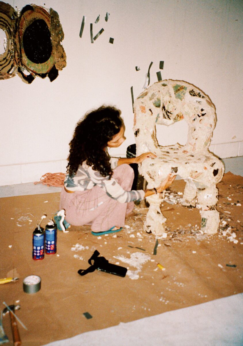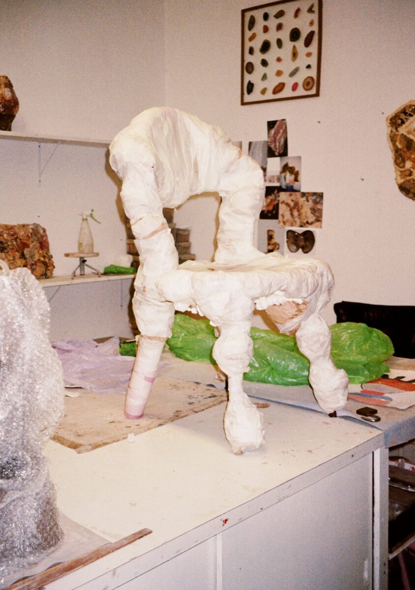 FM: Convidar a Anália para colaborar neste projeto foi essencial. Há muito tempo queríamos trabalhar juntas e, além de amiga, sou fã do trabalho dela. Acho que há uma sinergia muito forte entre nossas pesquisas e estéticas, embora cada uma expresse isso de sua própria forma. O processo de criação da cadeira Docinho começou a partir dos materiais que queríamos explorar mais. A Anália me falou sobre essa massa de celulose reciclada que descobriu no ano passado e compartilhou sua vontade de trabalhar com mobiliário e ampliar a escala do trabalho. Com a argila, temos a limitação do tamanho do forno, o que restringe um pouco a escala das peças. Na época, eu tinha vários pedaços de cerâmica no ateliê e estava pensando no que fazer com eles. Ao juntar essa massa com os pedaços de cerâmica, criamos a Docinho.