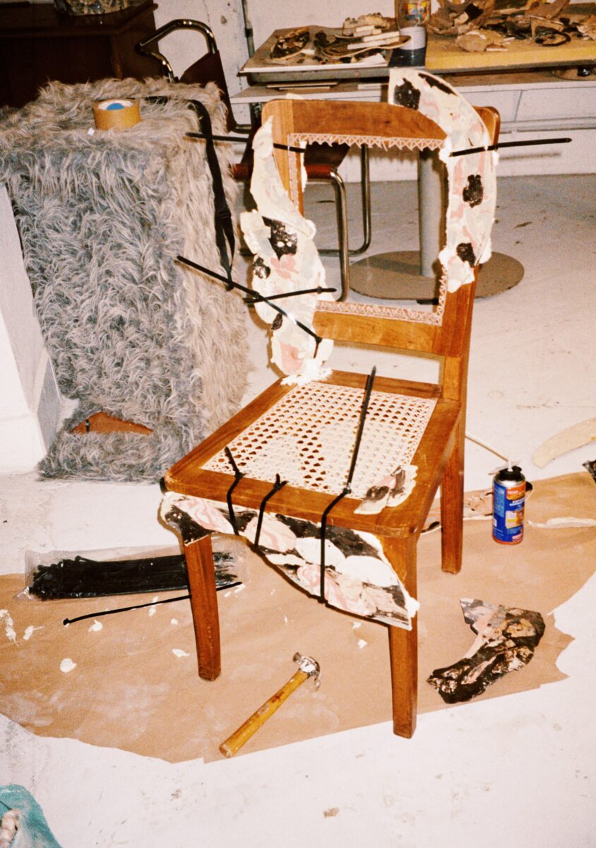 FM: Não senti muito essa transição. Foi super legal trabalhar com um material que não tem necessidade de ir ao forno, mas no fim foi um grande processo de colagem. O conceito de colagem/assemblagem/upcycling está sempre presente, acho que muito do que eu faço parte da colagem. E com a Docinho não foi diferente. Eu adoro ressignificar as coisas, e essa cadeira estava na minha casa esperando o seu momento. [risos]